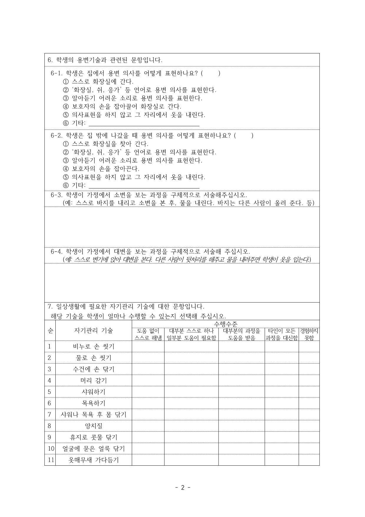 개별화교육지원계획 수립을 위한 구체적인 보호자용 기초조사서의 예시 (식사 및 용변 기술)