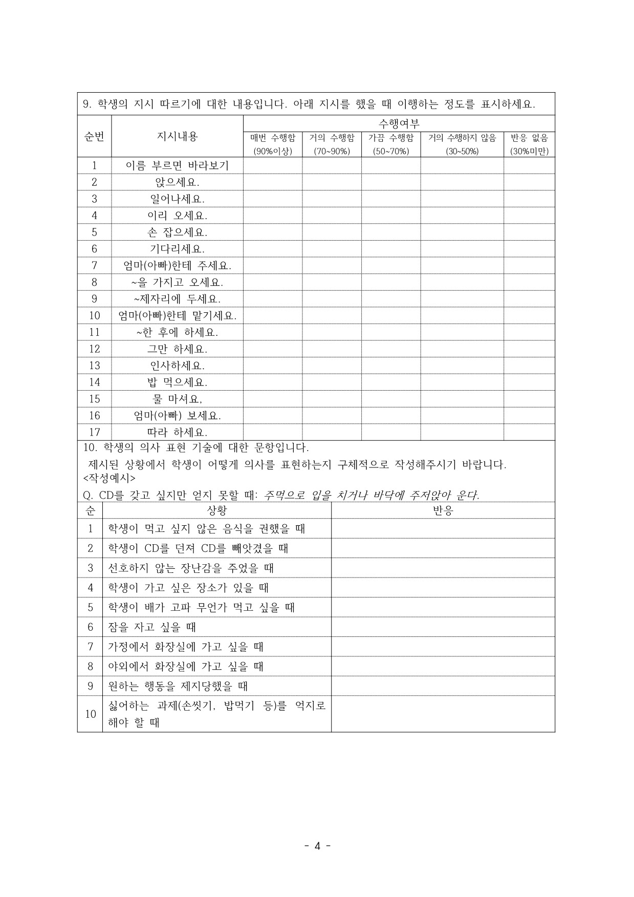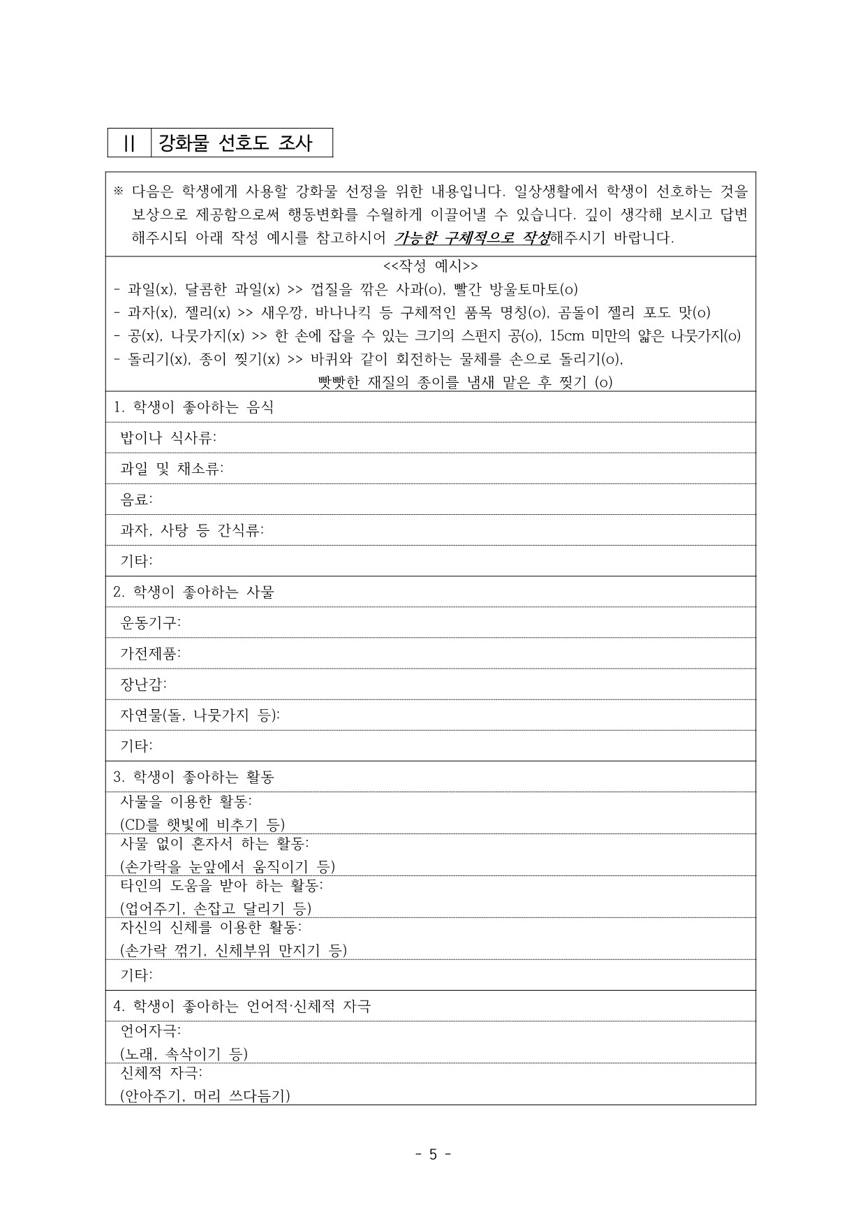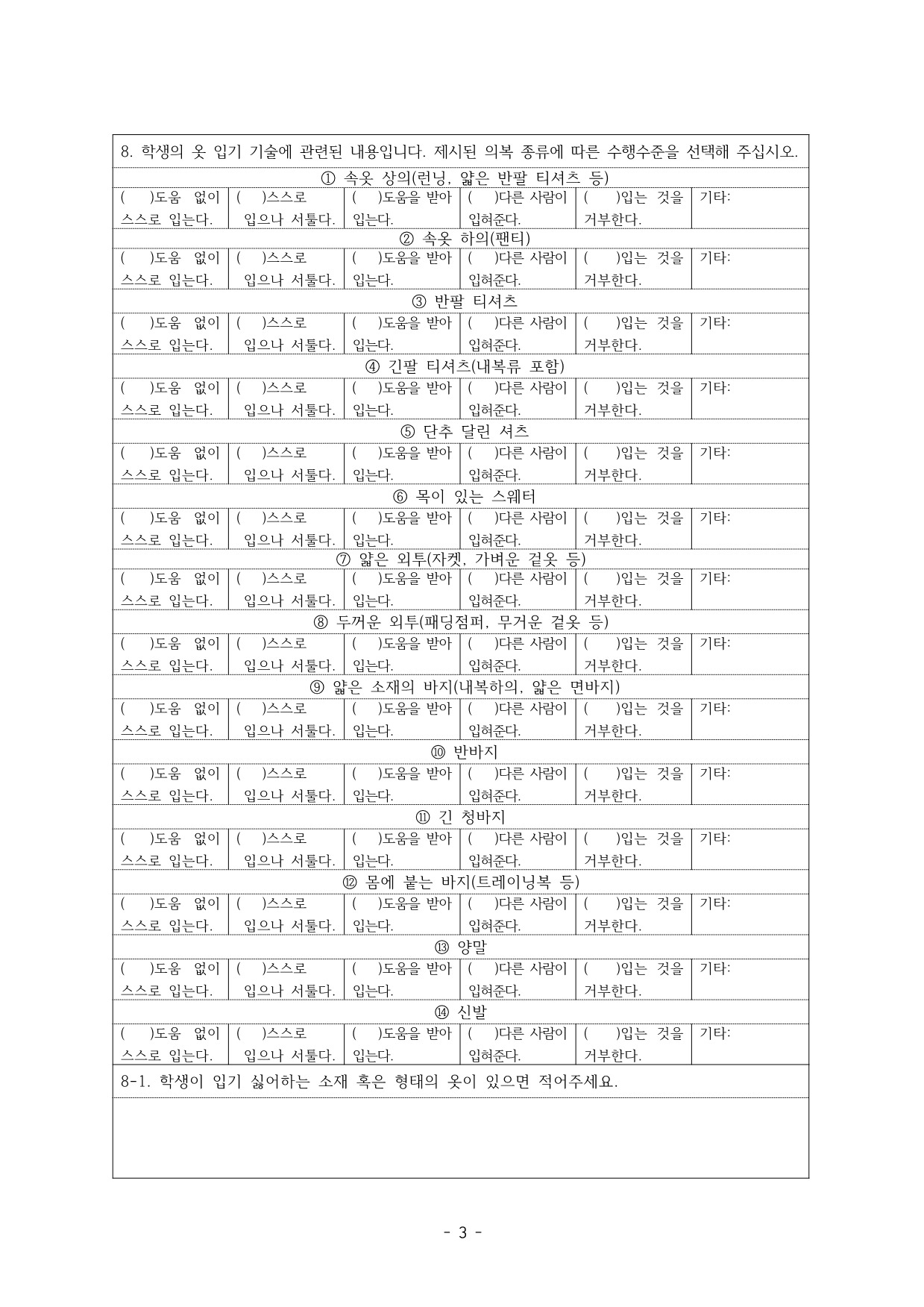 개별화교육지원계획 수립을 위한 구체적인 보호자용 기초조사서의 예시 (옷 입기, 지시 따르기, 강화물 선호도 조사)