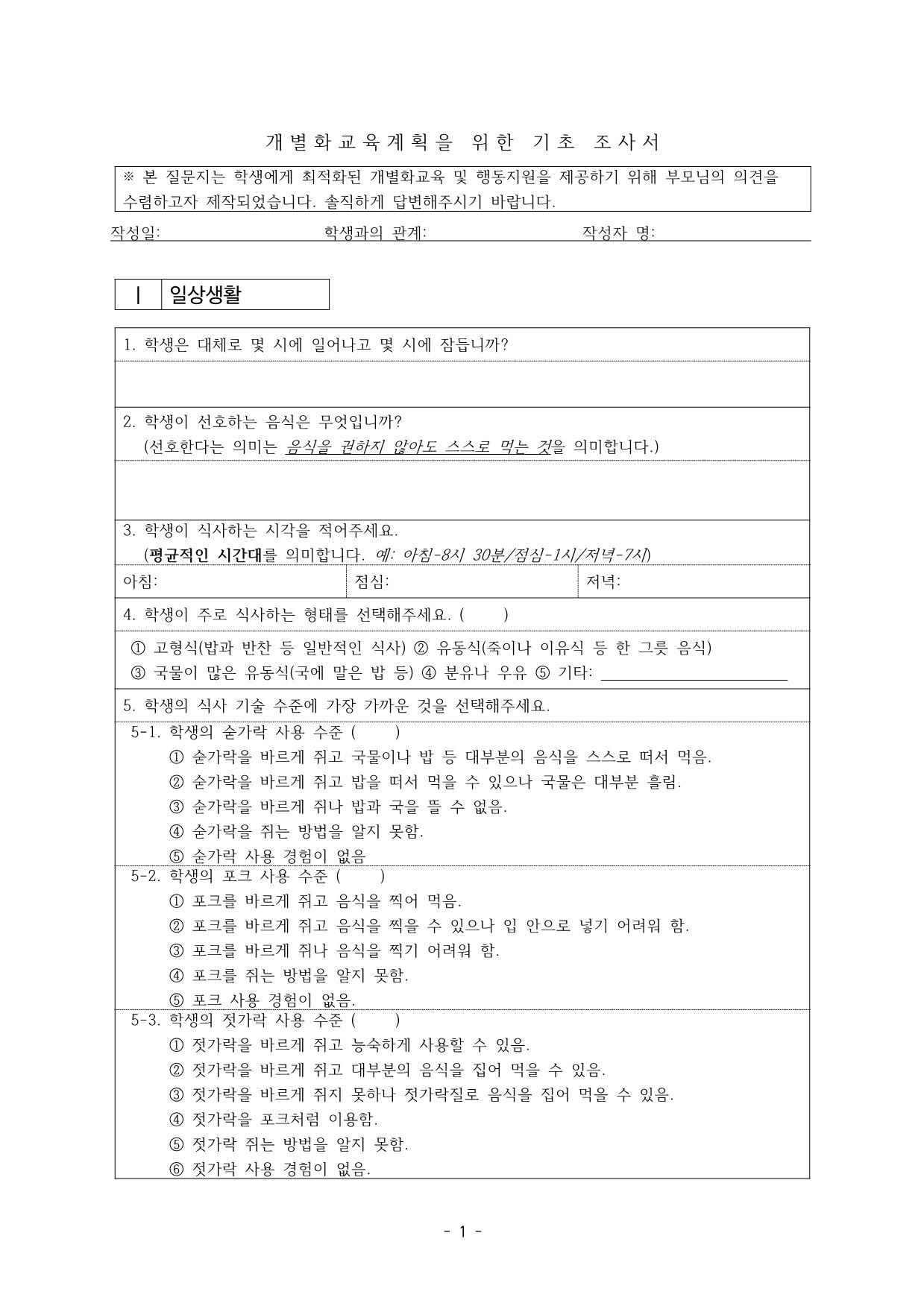 아마, 특수 선생님은 회의가 개최되기 전 기초조사서 양식을 학부모님께 전달해드렸을 겁니다. 바로 아래의 양식과 같은 조사서인데요. 학생의 현재 수준과 수행 정도를 가능한 자세히 알기 위한 설문지라고 생각하시면 됩니다.