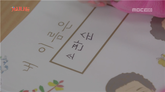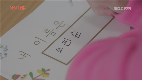 짝꿍과 할머니들은 표지 네모 빈칸에 네임펜으로 자신의 이름을 신중히 적는다. 새 책만큼 예쁘게 적고 싶은 마음. 공감이 간다. 표지에 이름을 적는 모습 중 최유정은 짝꿍이 있는 이유를 보여줬다. 할머니가 '소핀순'으로 이름을 잘못 적자 짝대기 하나를 더 그으라며 '소판순'으로 완성시켜주었다. 부족한 부분은 서로 채워나가며 함께 완성시켜나가는 역할. 짝꿍은 한글을, 할머니는 인생을 알려주며 그들은 조금은 느리지만 정답게 배워나갈 모습을 기대해본다.