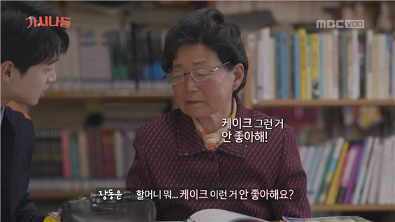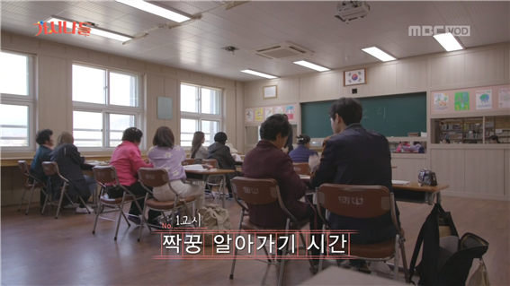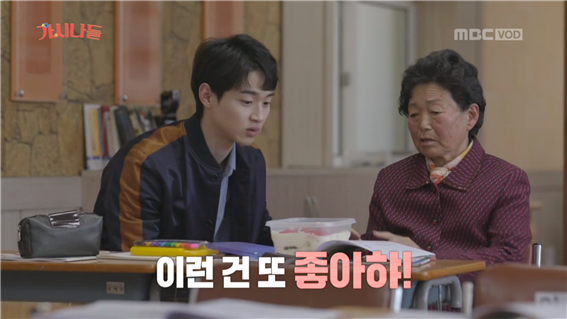 조금은 긴장됐던 1교시가 끝나면 쉬는 시간이 찾아온다. 첫 쉬는 시간엔 '마이쮸 먹을래?'라며 먹을 걸로 말문을 트며 친해지는 모습들을 자주 볼 수 있었다. <가시나들>의 첫 쉬는 시간에도 먹을 건 빠지지 않았다. 장동윤 짝꿍은 직접 만든 티라미수 케이크를 꺼내보였다. 흰 크림 위 박혀있는 빨간 딸기까지 누가 봐도 정성스레 만든 것이었다. 방금 1교시에 빵 안 좋아한다는 할머니도 동윤이 만들어온 케이크에 '이런 건 또 좋아햐!'라고 말을 바꿔 본다. 장동윤 짝꿍이 만들어온 케이크를 나눠 먹으며 달콤했던 쉬는 시간이 가고 다시 본격적인 2교시 수업이 시작됐다.