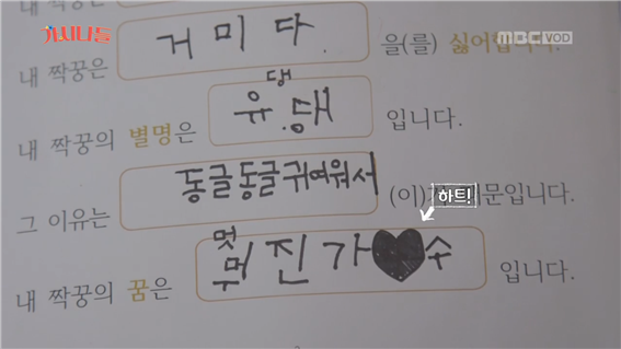 나이는 쓰기 싫다는 짝꿍에 나이는 하트로, 글씨가 틀려 지저분한 곳도 하트로 가려주는 최유정 짝꿍의 센스. 1교시 '짝꿍 알아가기' 시간에는 최유정 짝꿍의 센스가 돋보였다. 나이는 쓰기 싫다는 짝꿍에 나이는 하트로, 글씨가 틀려 지저분한 곳도 하트로 가려준다. 짝꿍이 있기에 틀려도 즐겁다. 그렇게 짝꿍들은 서로 묻고 답하며 '짝꿍 알아가기' 페이지를 채워간다.