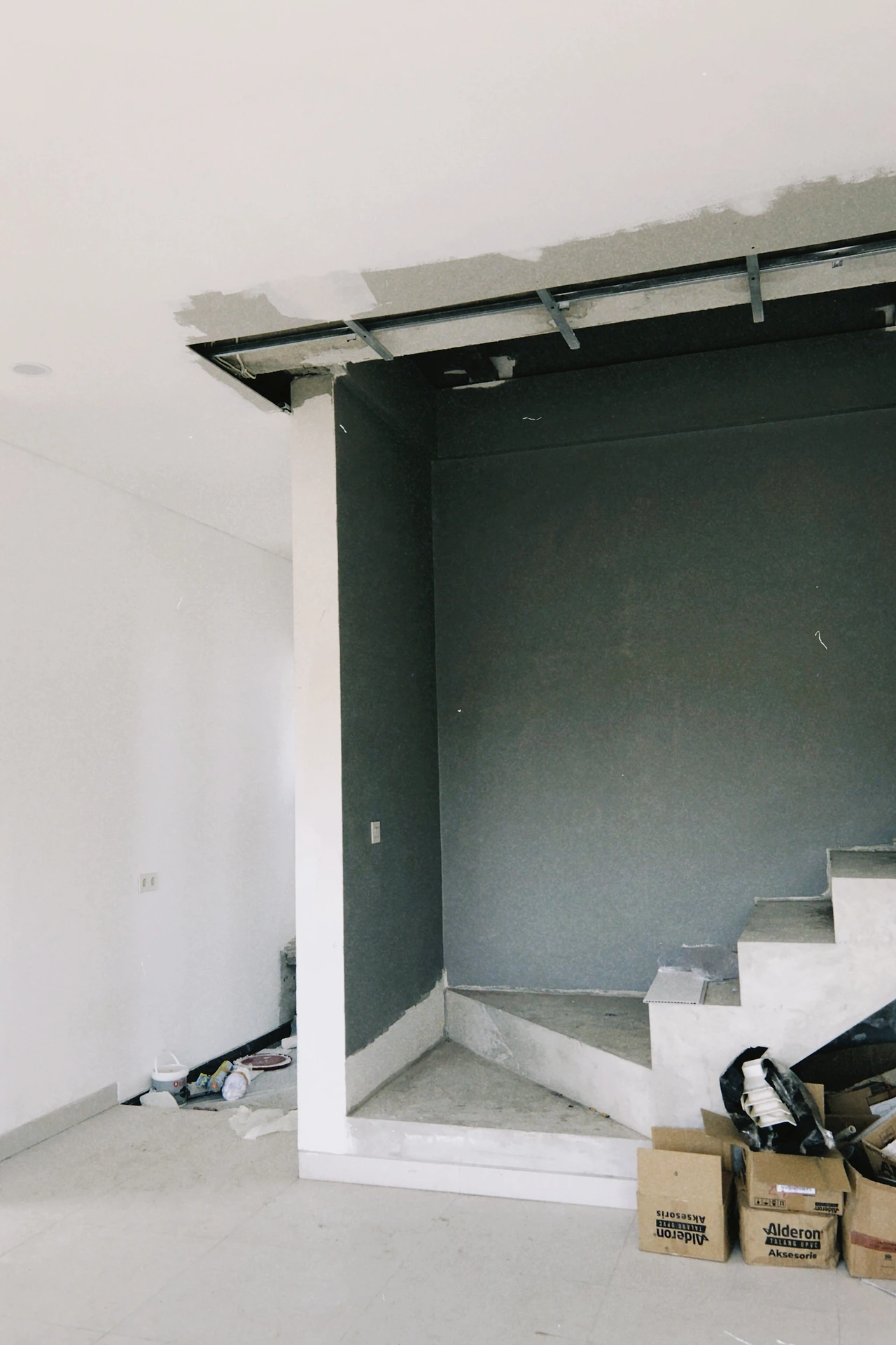 페인트 색을 고르고 도저히 어떤 분위기 일지 감이 안 잡혀 건축현장에 가서 직접 분위기를 살폈다. 실재 회색 페인트가 칠해진 모습을 보니 빛이 있는 곳과 빛이 없는 곳의 색감차이가 생각보다 컸다. 그래서 빛이 비교적 잘 들어오지 않는 드레스룸은 흰색 페인트로 마감하기로 하고 큰 창문이 있어 빛이 잘 들어오는 쪽은 내가 고른 회색 페인트로 칠하기로 했다. 이렇게 하니 빛과 색의 발란스가 맞는 느낌이었다.
