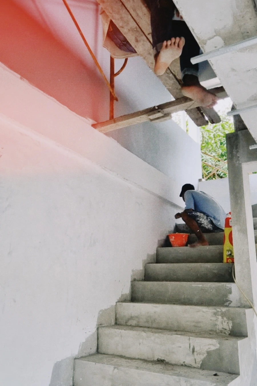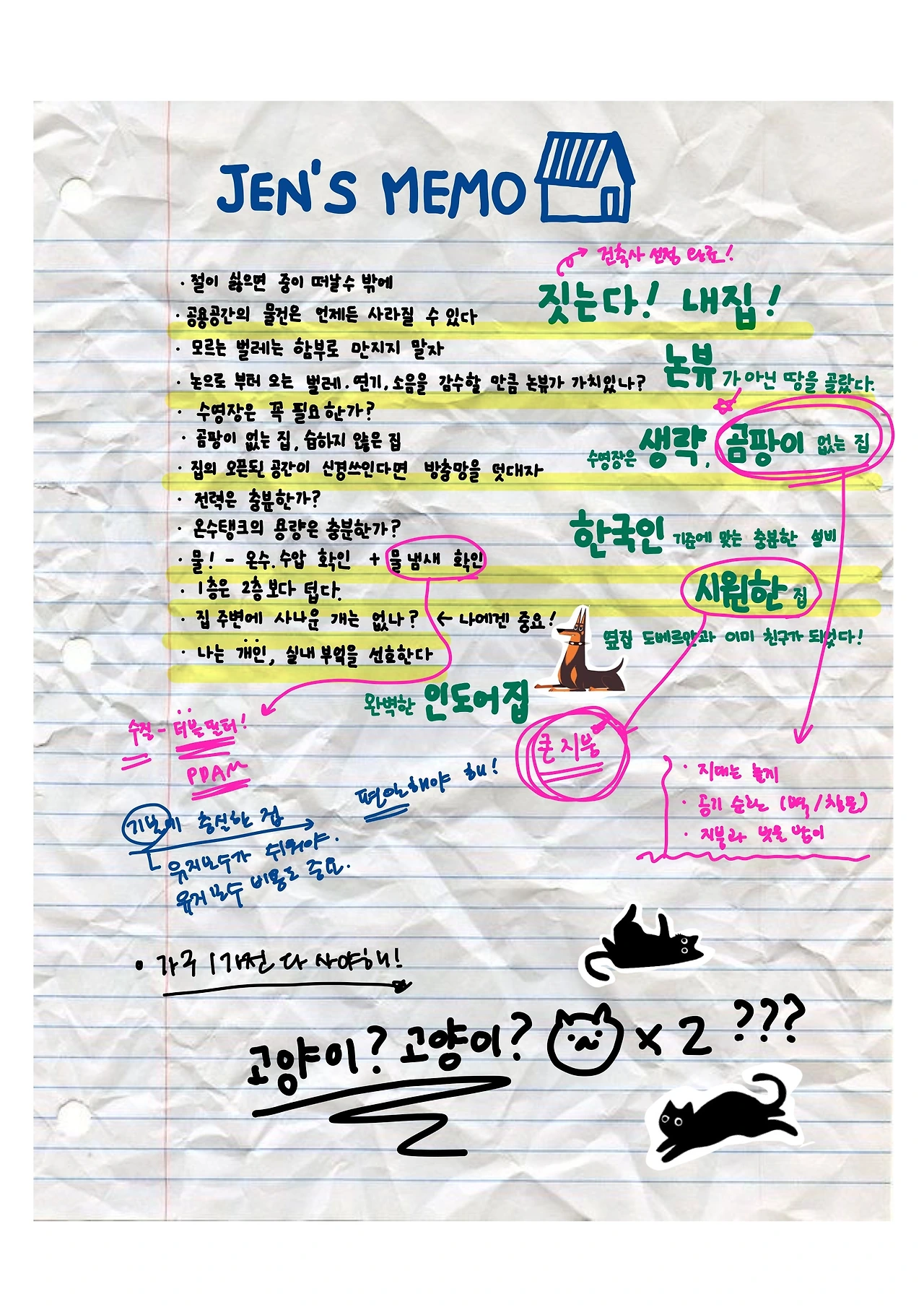 사실 나는 동물을 무서워해서 처음에는 경계하고 있었는데 매번 공사 현장을 방문할 때마다 이 두 고양이는 나를 살갑게 맞이해 주었다. 아무래도 어릴 때부터 여러 인부들의 손을 타며 자란 고양이들 인지라 사람을 잘 따랐다. 고양이들은 내가 다가가면 언제나 머리를 이리저리 내 다리에 부딪히며 반갑게 인사를 했고 내가 집을 둘러보면 마치 자기들이 집주인인 양 쫄래쫄래 나를 따라와 잔소리하듯 야옹거렸다. 공사 현장이 거칠고 위험할 만도 한데 아무래도 고양이여서 그런지 이 둘은 폴짝폴짝 여기저기 잘도 올라다녔다. 오히려 이곳을 즐기는 것 같았다. 어느 순간 현장을 보러 오는 일이 이 고양이들을 보러 오는 일이 되어 버렸다.
