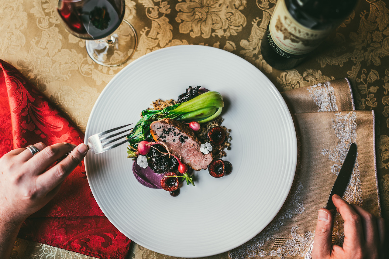 Tri-colored quinoa, red cabbage purée, seared baby Bok Choy, red radish, wood ear mushrooms, fresh red cherries, port reduction