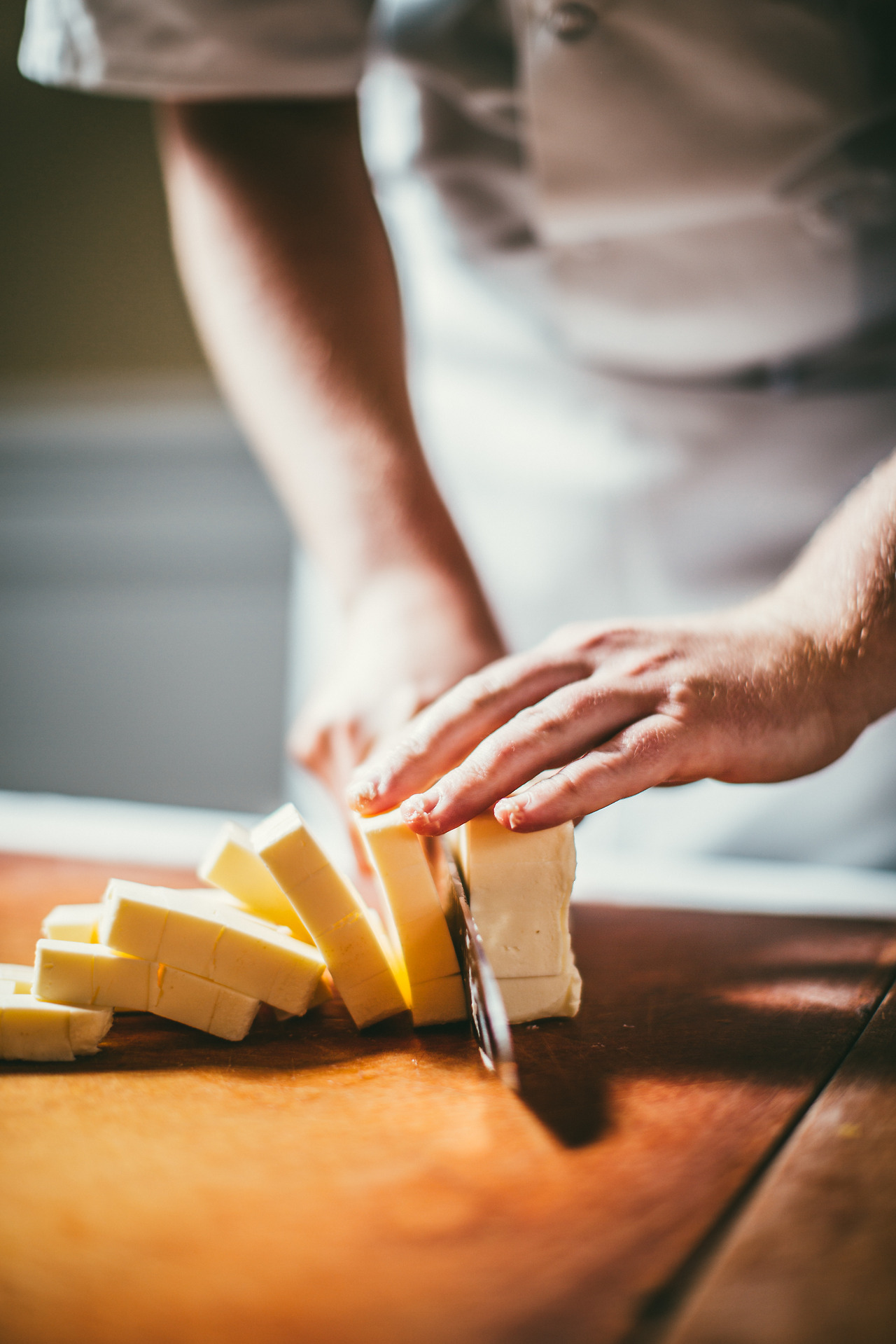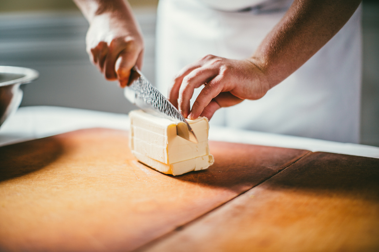 처음 비스킷을 만들 때 셰프님은 먼저 버터를 칼로 작은 주사위 크기로 자르기 시작했다.