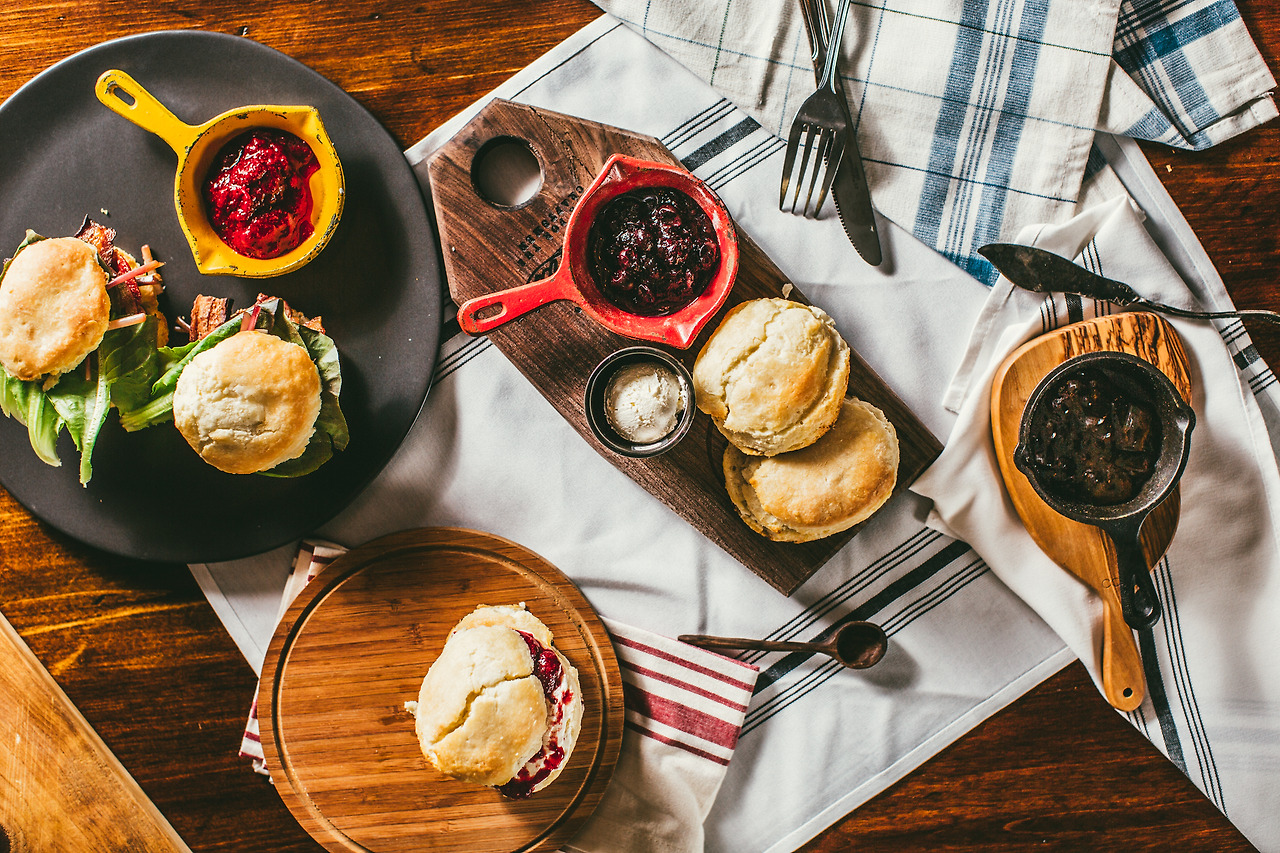 갓 구워진 비스킷은 다양하게 자신이 좋아하는 취향에 따라 다양하게 맛볼 수 있다.