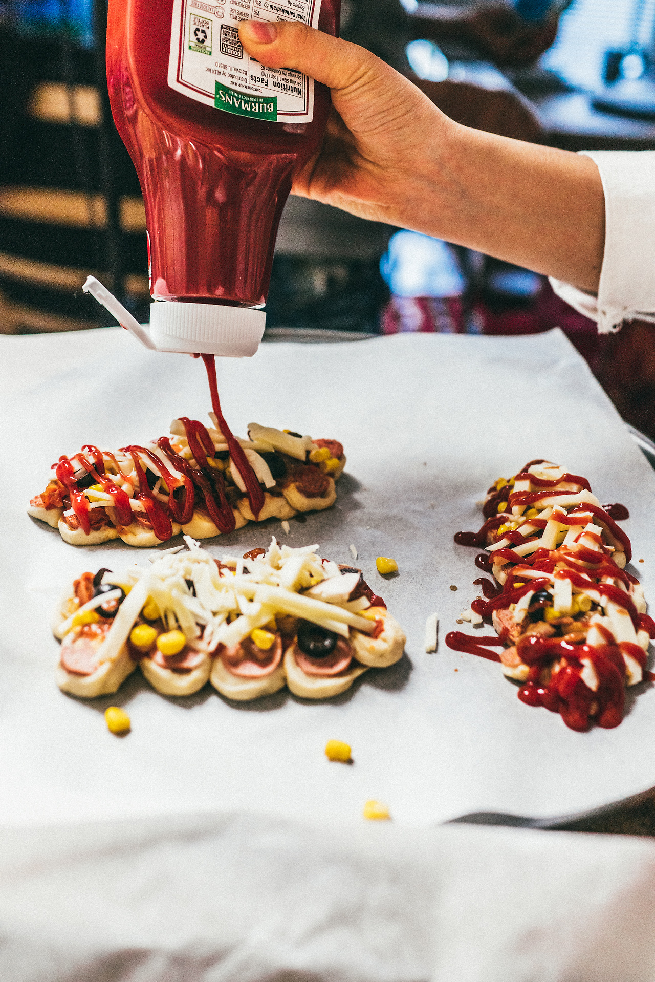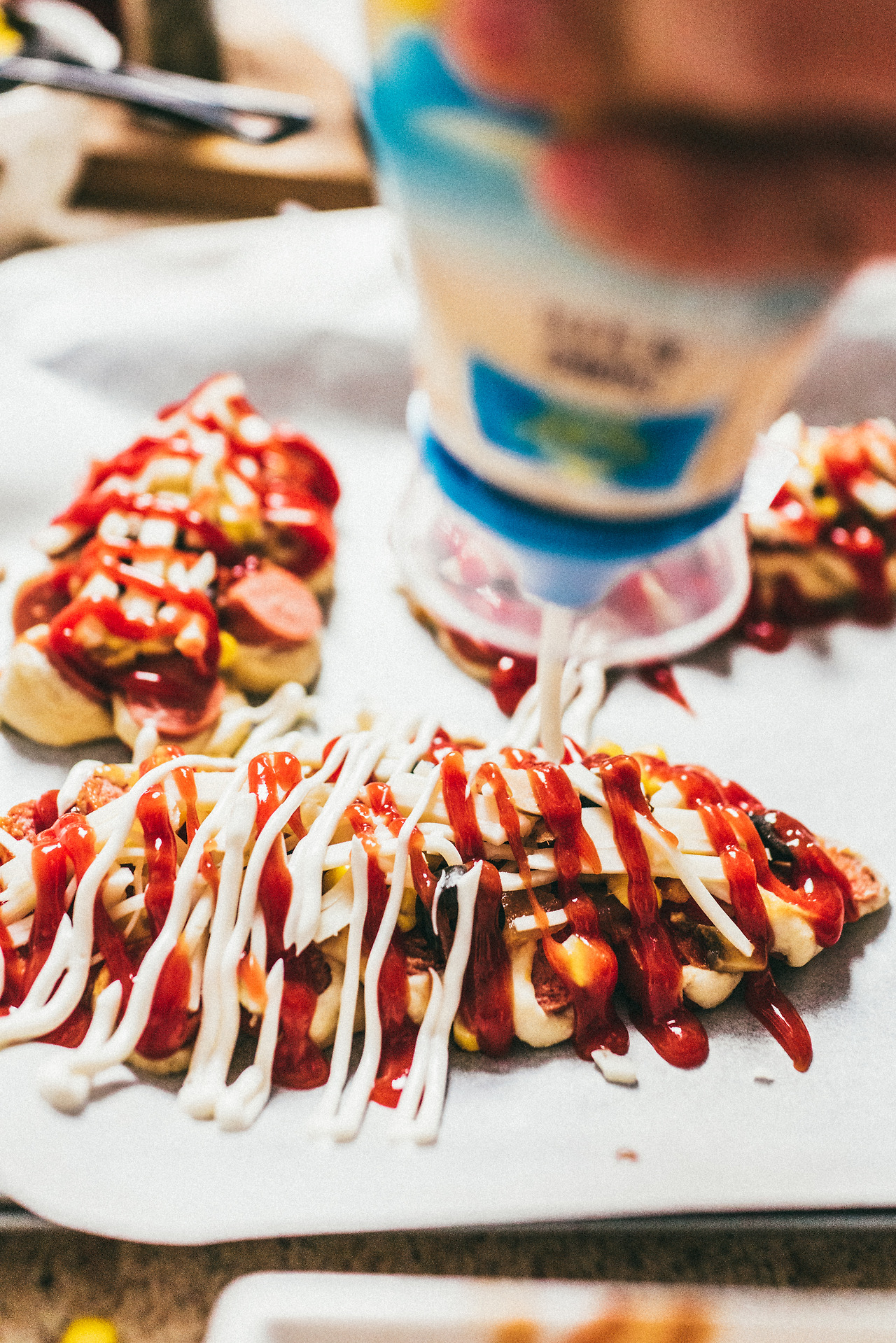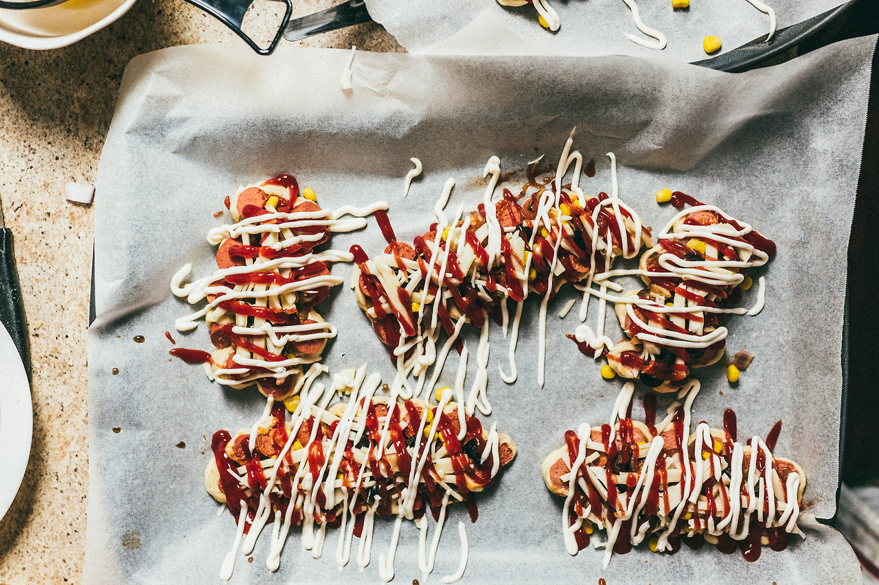 옥수수콘, 케첩과 마요네즈가 올려 구워진