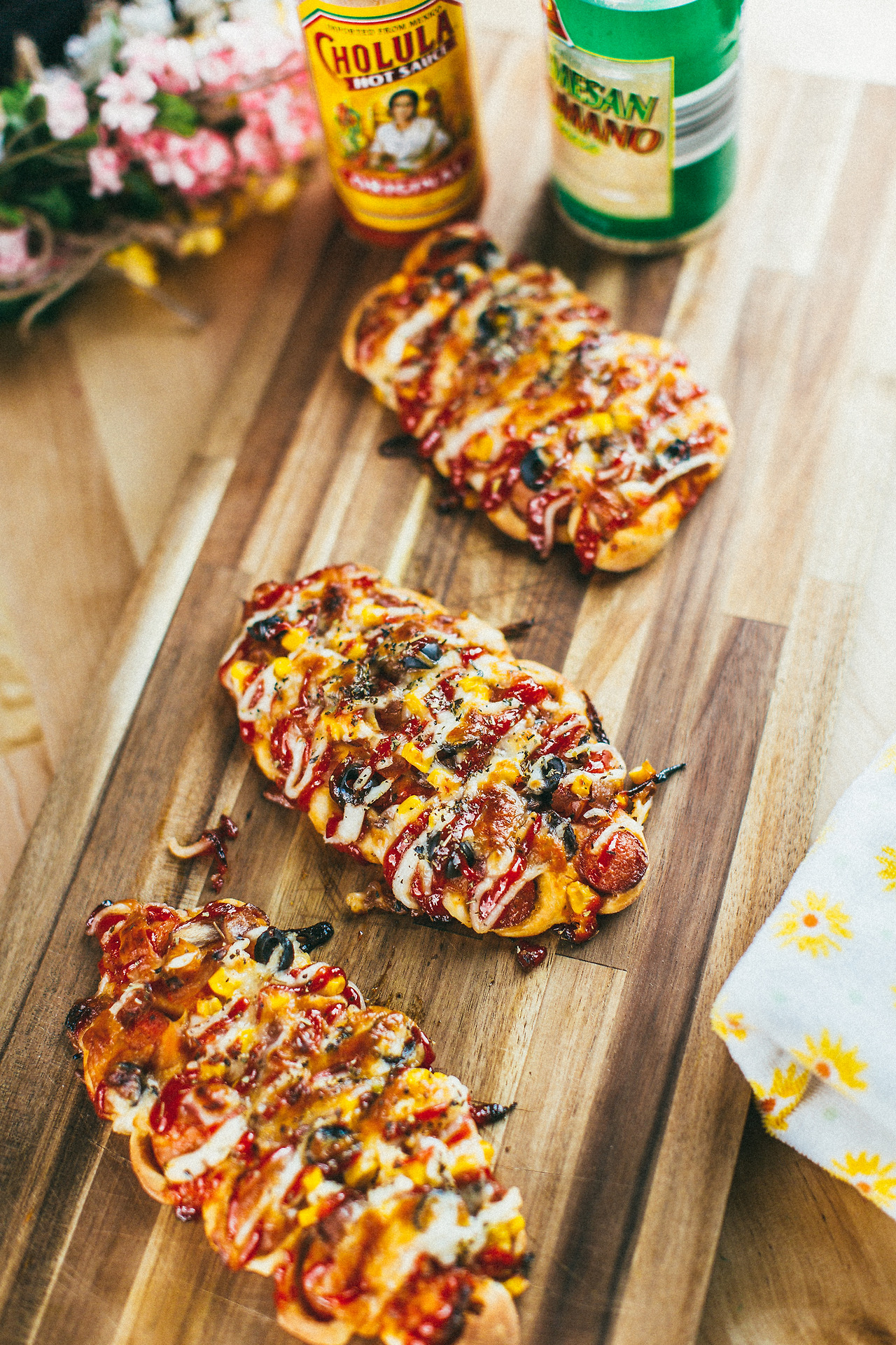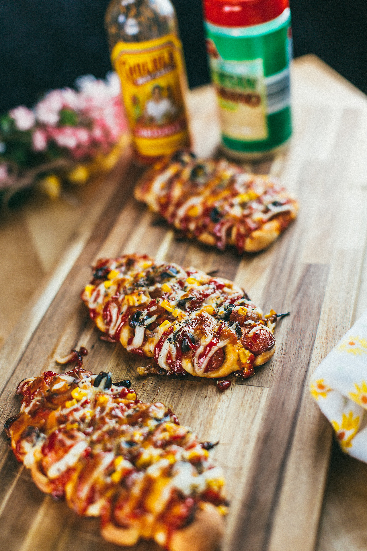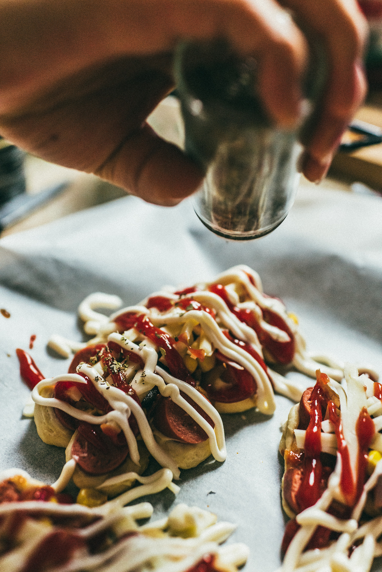 옥수수콘, 케첩과 마요네즈가 올려 구워진