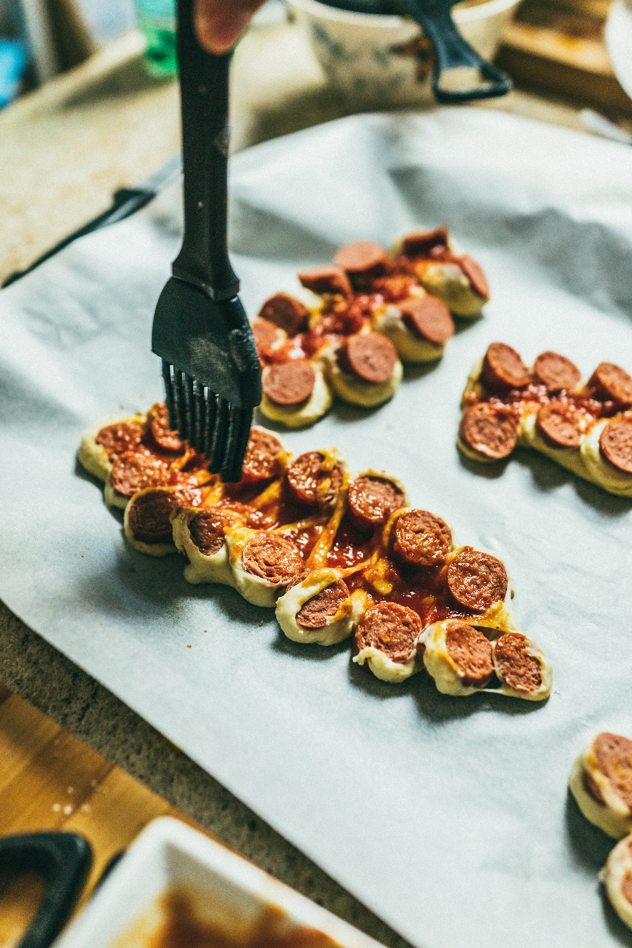 그다음은 칼이나 가위를 사용해 돌돌 말린 소시지 반죽을 소시지 아래 까지만 잘 잘라줘야 한다(반죽 아래쪽은 자르지 말고 남겨두는 게 포인트 오직 소시지만!)