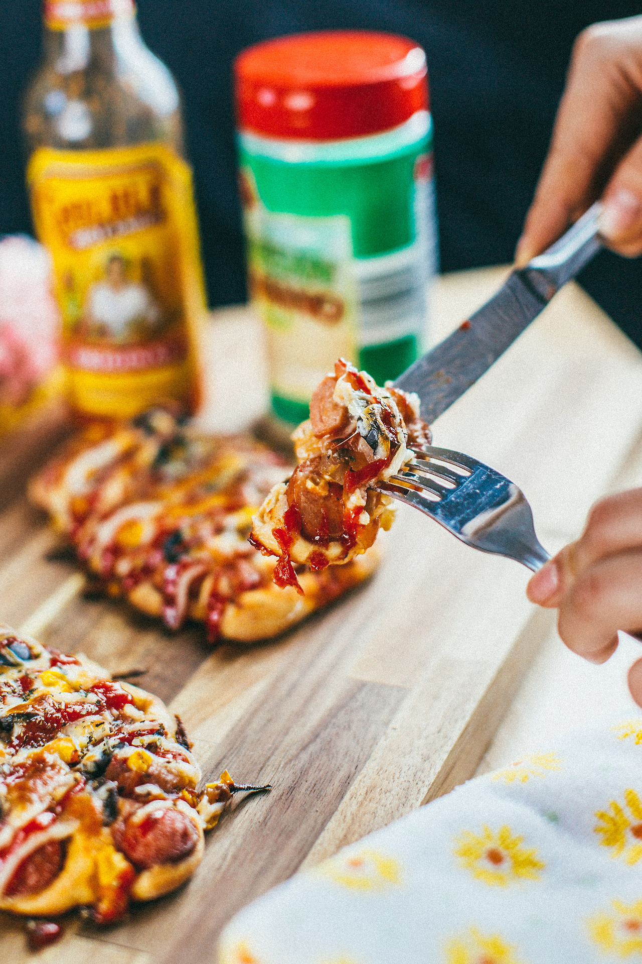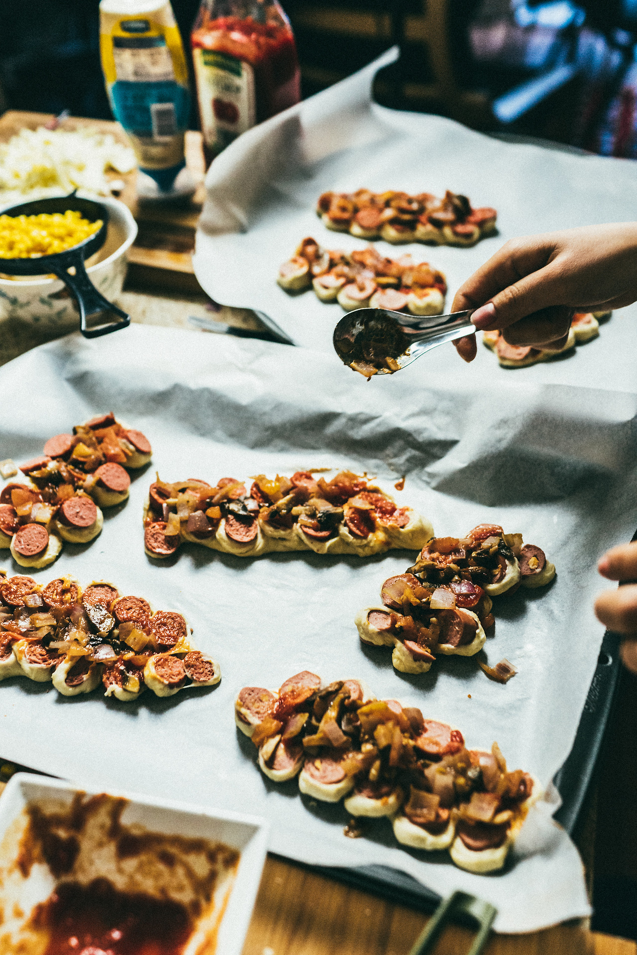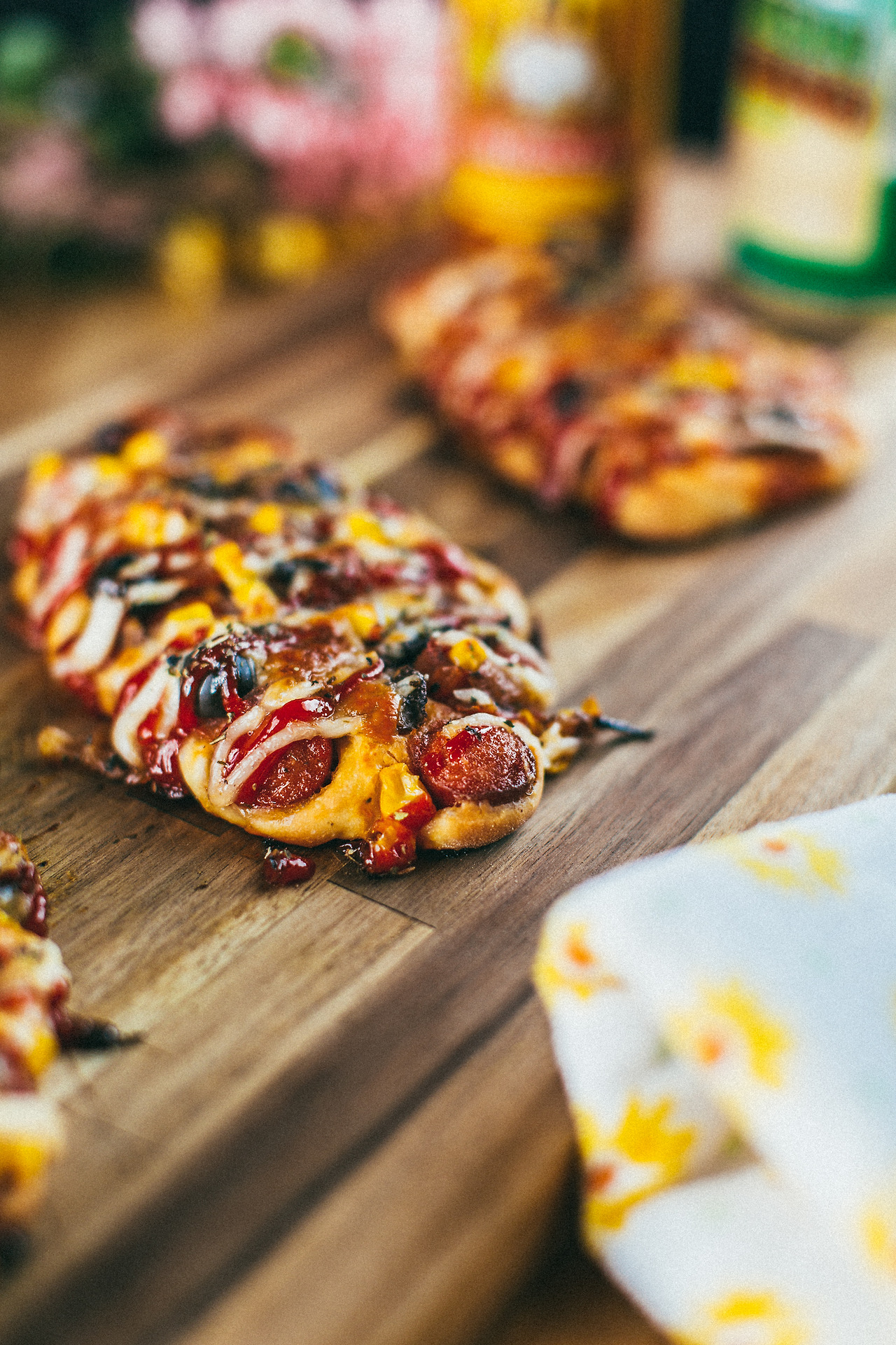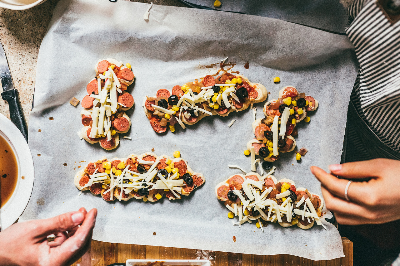 잘린 소시지를 머리를 따듯이 옆으로 눕혀 피자빵 모양을 만들어 주면 된다.