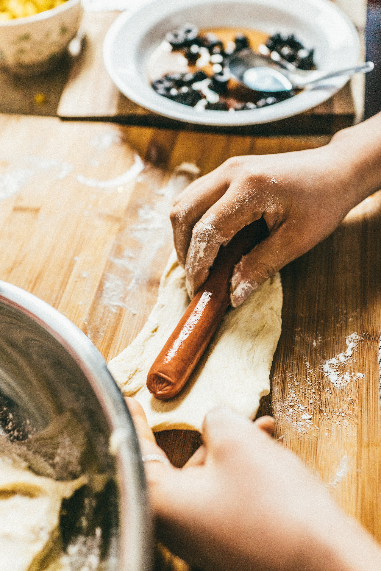 이렇게 처음에는 소시지가 반죽에 돌돌 말려 보이지 않아야 한다.
