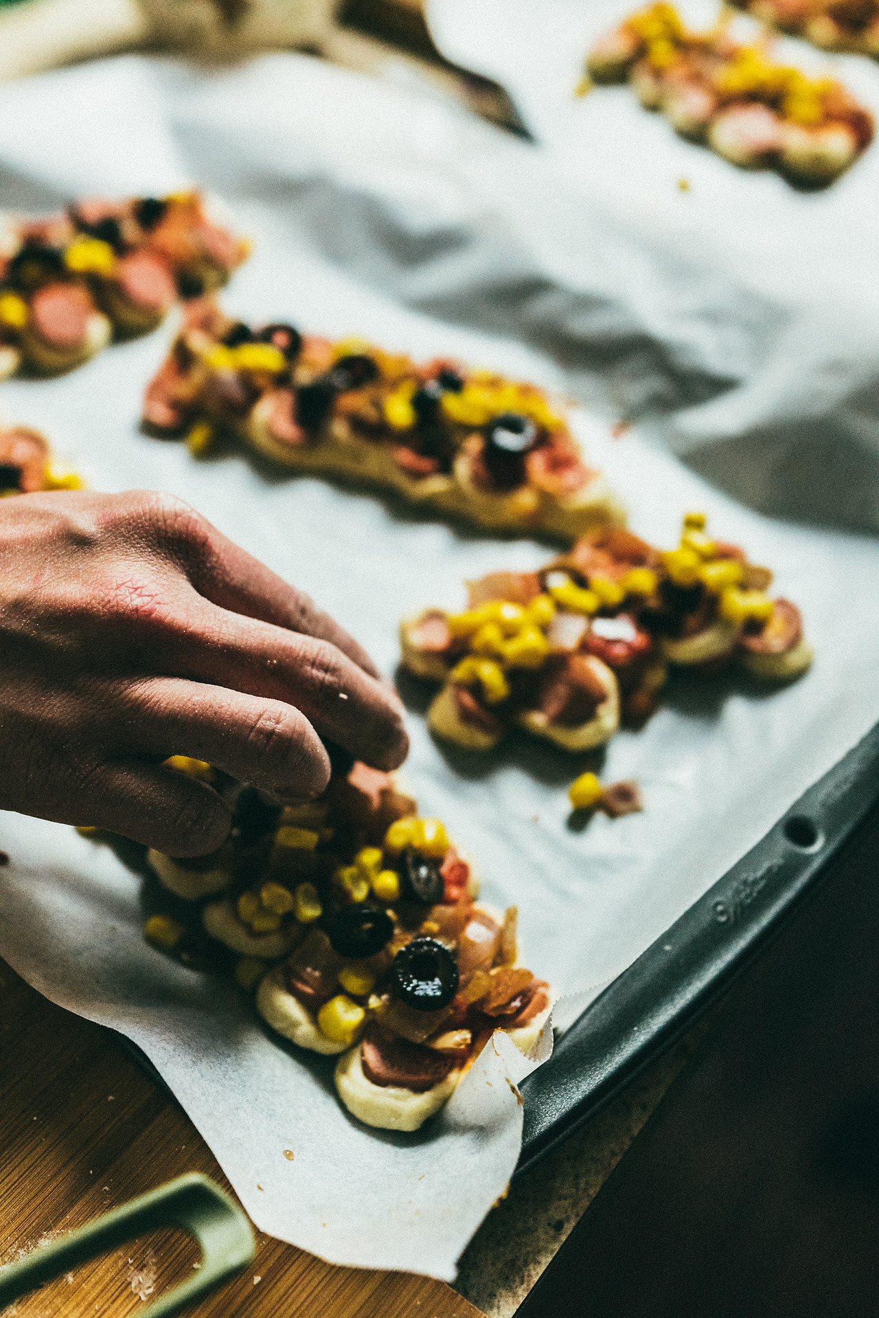 반죽을 자르고 넓힐 때는 나무 도마 위보다는 오븐에 넣을 판 위에서 잘라주고 모양을 잡는 게 편하다.