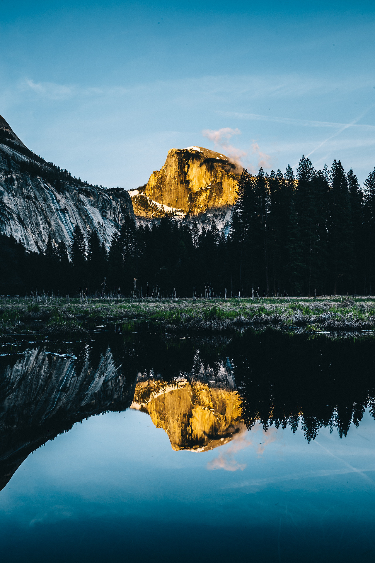 저수지에 반사되는 붉은빛은 하프 돔의 찬란한 모습에 깊은 감동이 느껴진다.