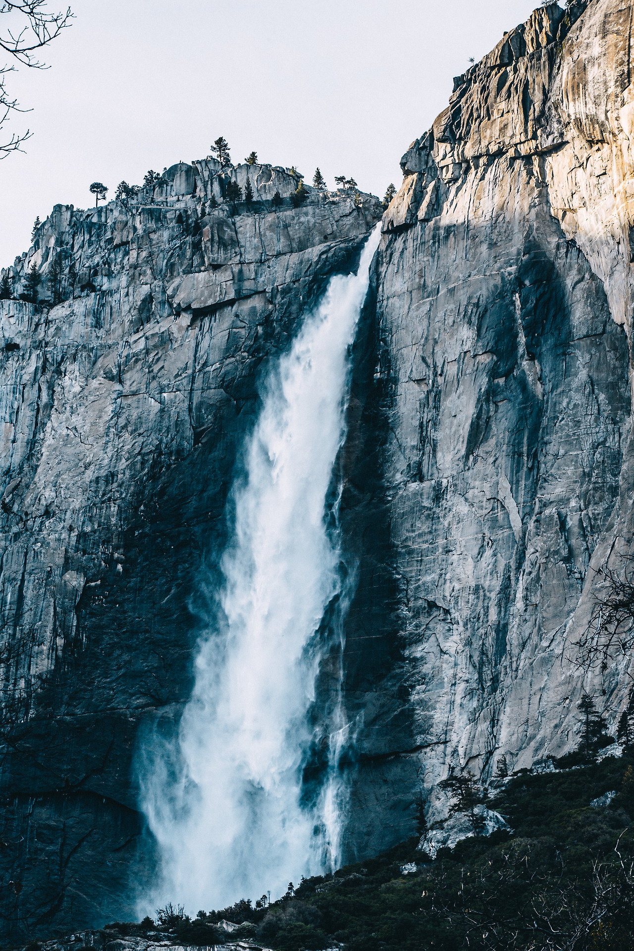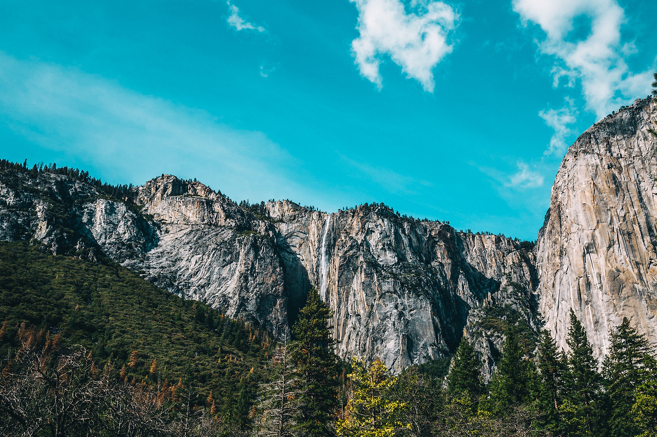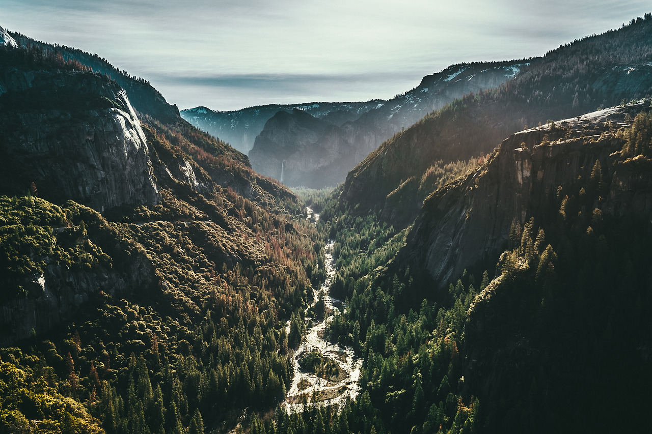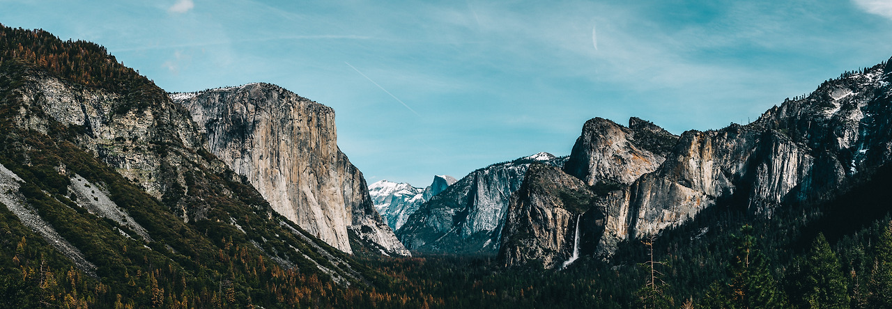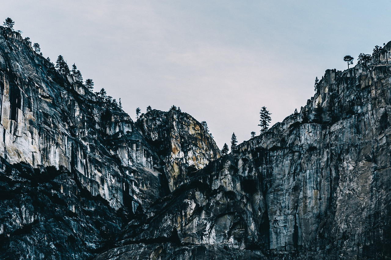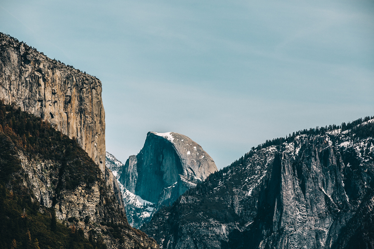 거대하면서도 조각 같은 암벽이 요세미티 숲 양 옆으로 우뚝 서있고
