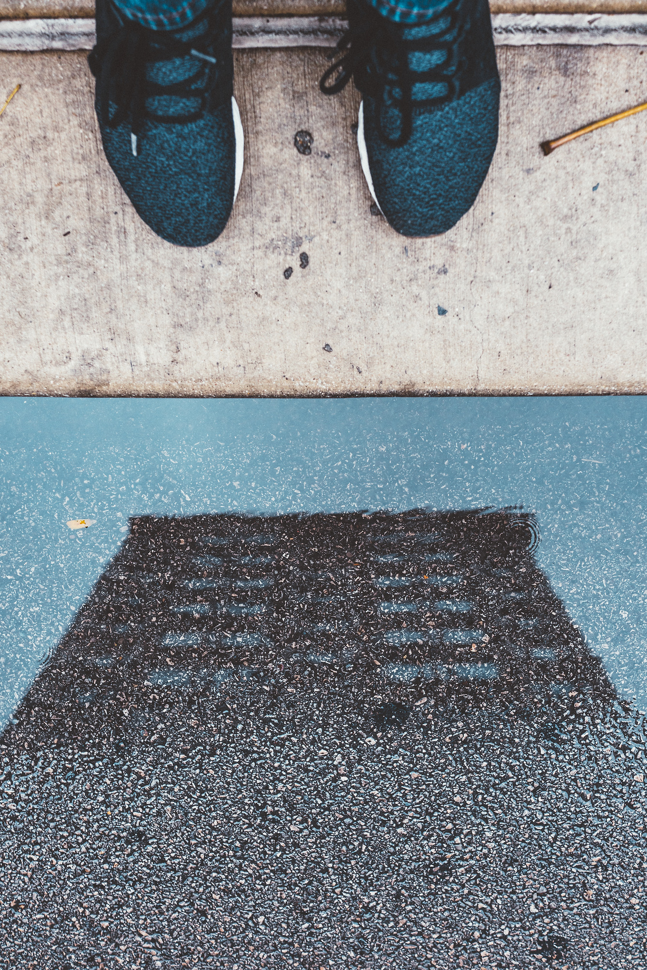 그리고 빗방울에 파동을 일으키는 땅위에 반사된 도시.