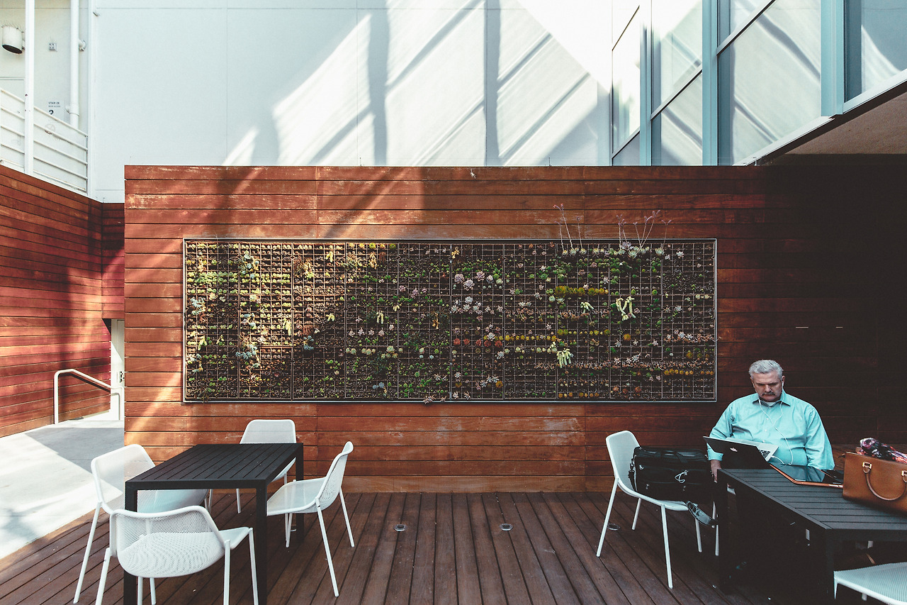 로비 옆쪽으로 이어져 있는 테라스에 나가보니 간단한 식사 또는 차 한잔을 할 수 있는 야외 공간 또한 자리하고 있었다. 이 공간에는 나무한 그루가 곱게 심어져 있었고 여러 가지 생화들이 한쪽 벽면에서 자라나고 있었다. 자리 곳곳에 소소하지만 섬세한 친환경적인 요소들이 에어비엔비에서 일하거나 방문하는 사람들에게 안락하면서도 편안한 느낌을 가질 수 있게 마련되어 있었다.