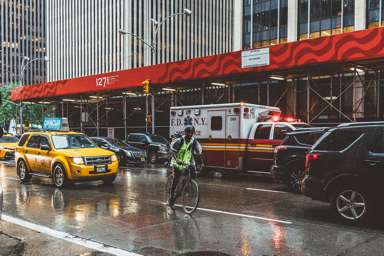 비를 가로지르며 마주하는 뉴욕 도시의 풍경은 인상적이다. 우산을 쓰고 택시를 기다리고 있는 사람과 그 사람을 스치는 거세게 자전거를 모는 사람, 자동차들은 쉴 새 없이 빠방 소리를 내며 성을 내고 있었다. 그러다 쿵 앰뷸런스와 운전기사의 접촉사고도 목격하게 된다. 딱 봐도 엠뷸런스가 뒤에서 사고를 내 보였다. 인도 사람처럼 보이는 차주는 큰 소리로 화를 내며 버럭 거리고 엠뷸런스에 타고 있던 구조 대원들은 난감한듯한 표정을 짓고 있다. 오직 뉴욕에서만 가능한 상황이지 않을까?