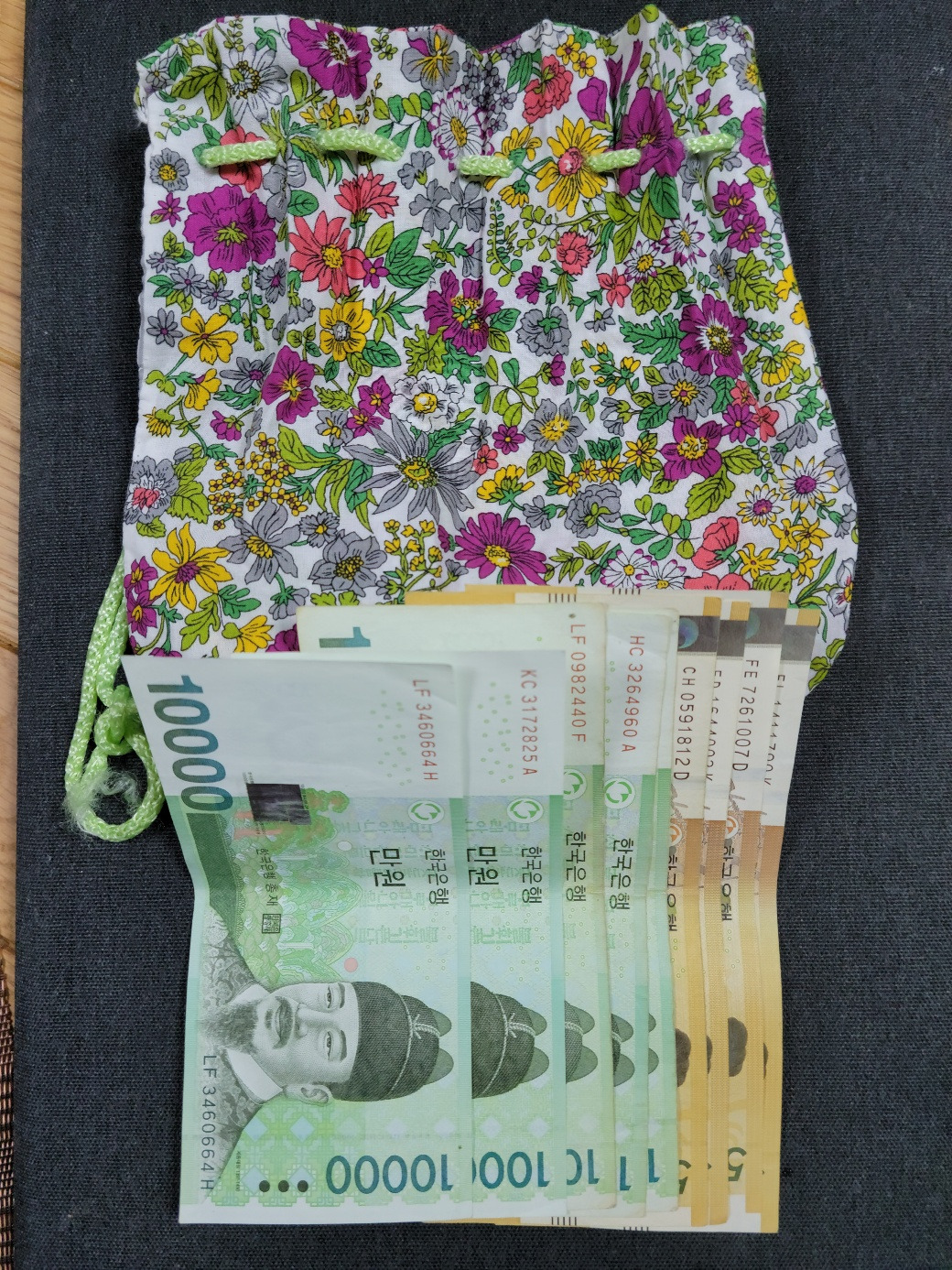 그동안 아끼고 아껴 모은 돈을 복주머니에 넣어서 주셨습니다.