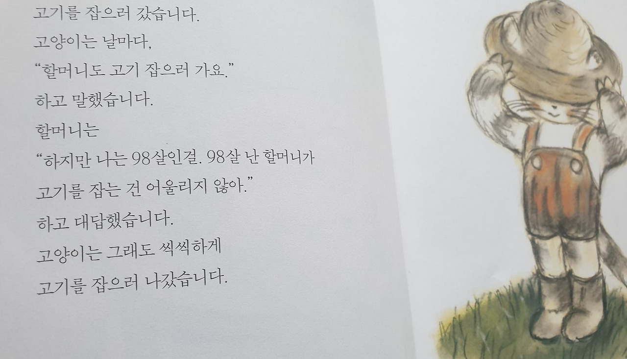 할머니는 “하지만 나는 98살인걸. 98살 난 할머니가 고기를 잡는 건 어울리지 않아.”라고 하지요.