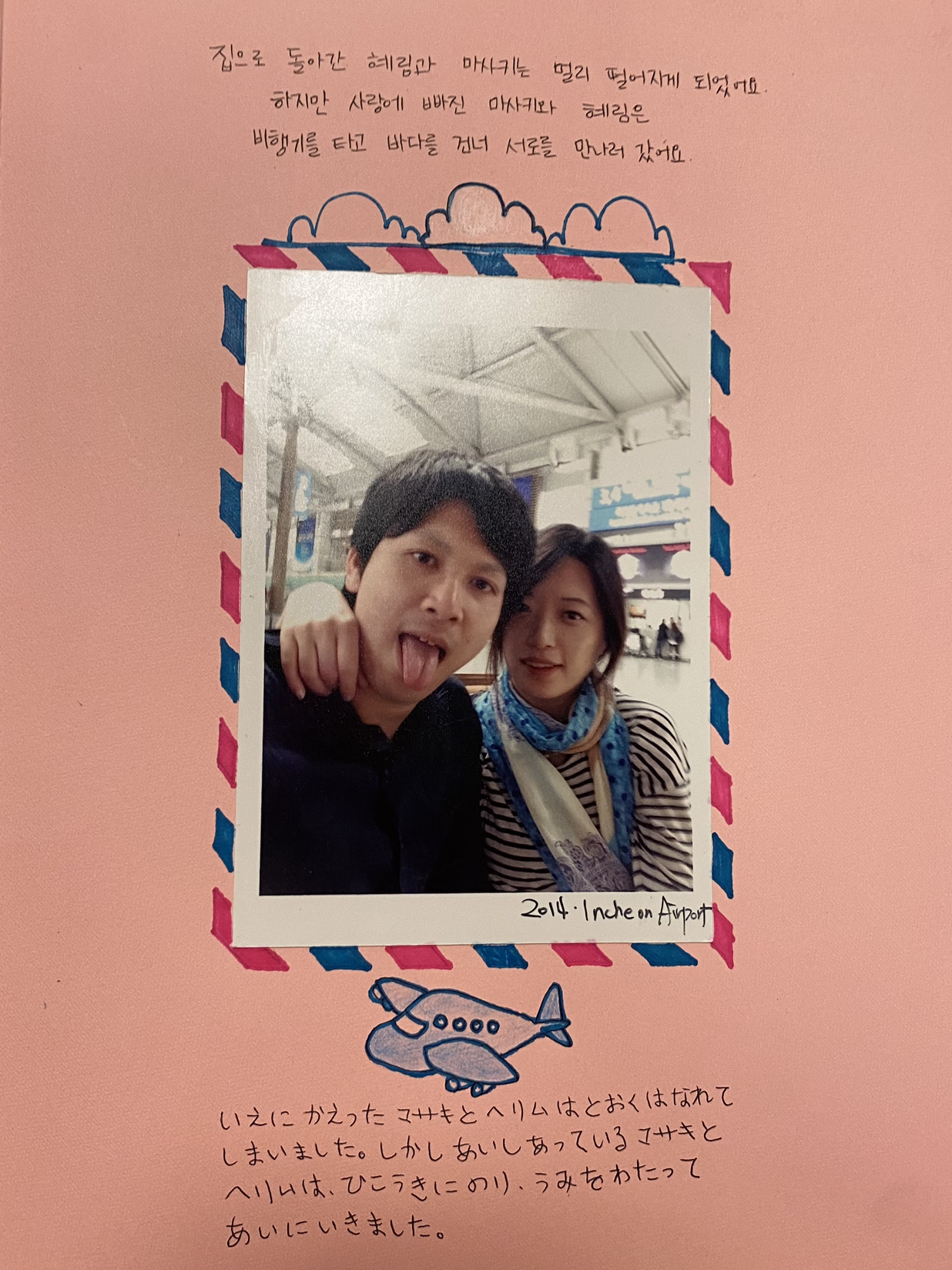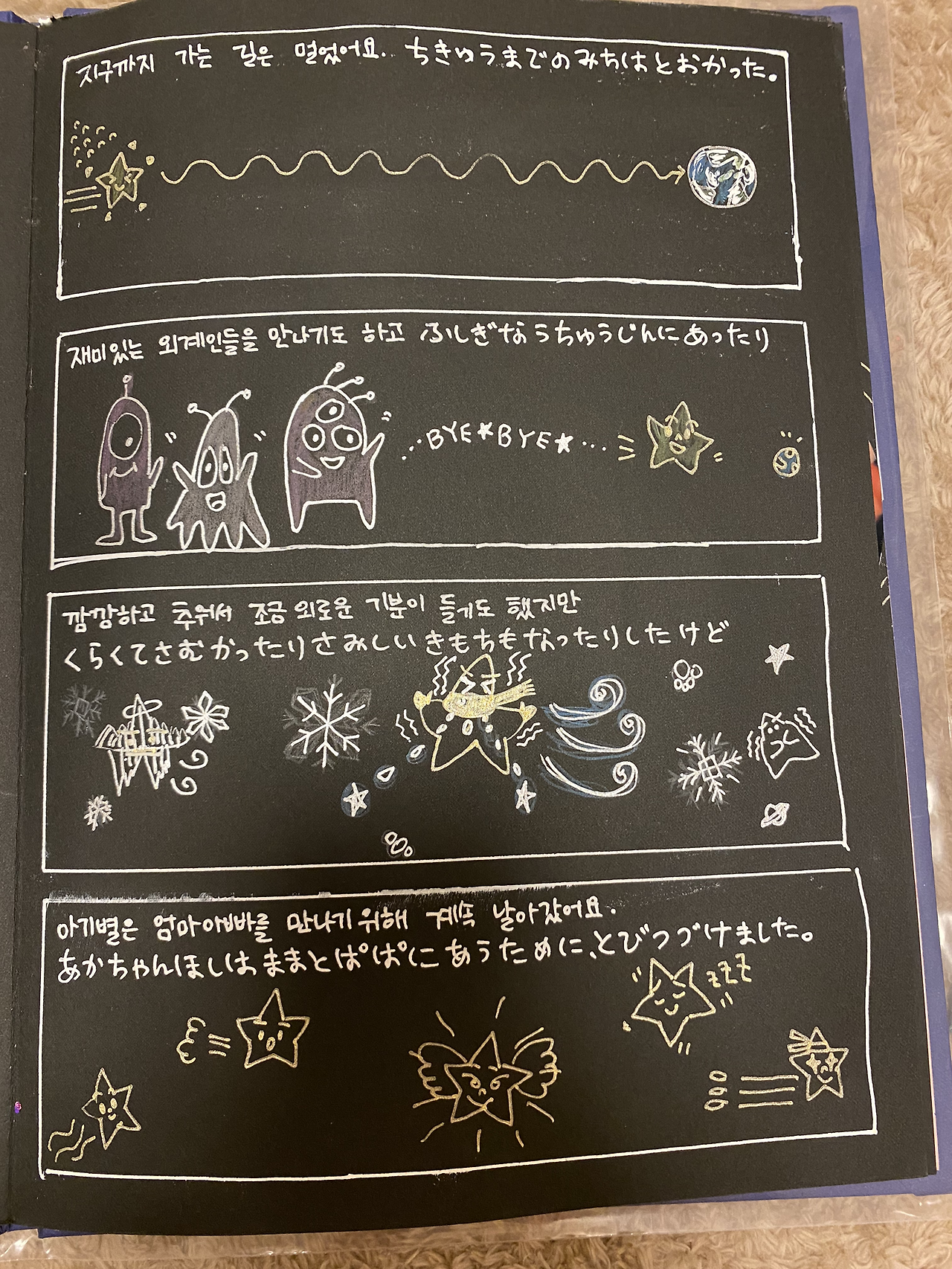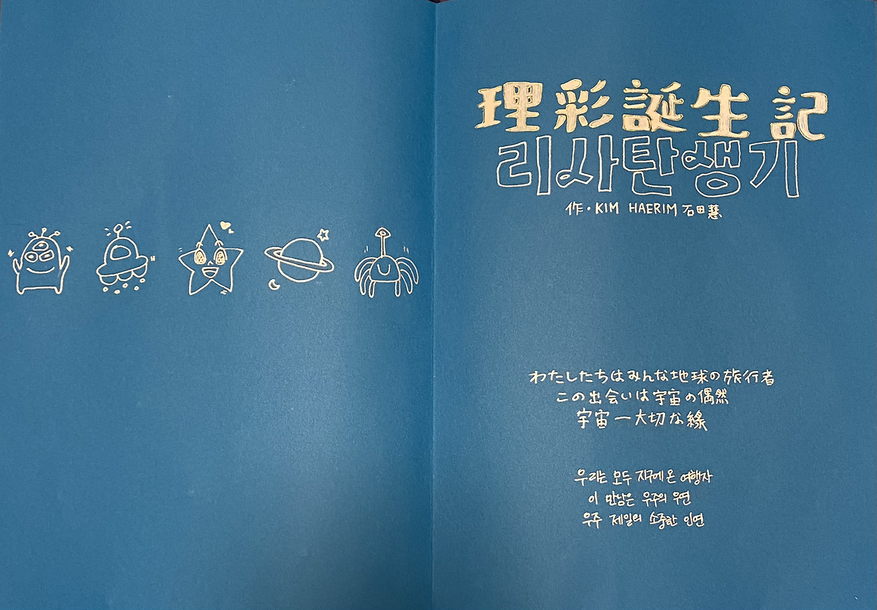 소재를 정하고 스토리를 구상하고 페이지 레이아웃을 생각해보고 사이즈 재단, 제본, 표지 만들기까지 가위로 자르고 풀로 꾹꾹 붙여 누르고 펜을 골라 글씨를 눌러쓰고...