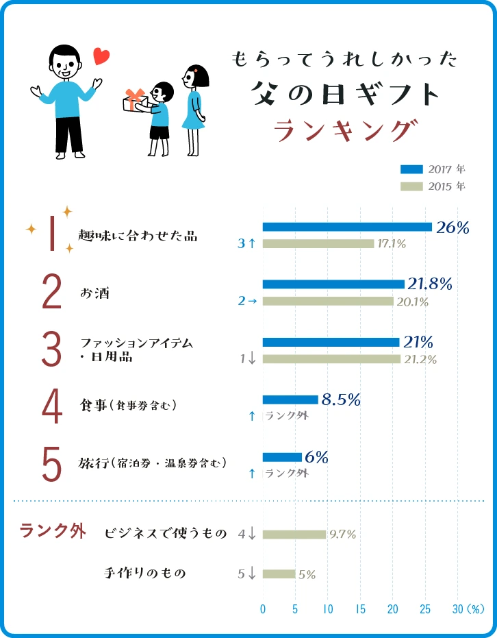 아버지의 날에도 역시 현금을 드리는 건 일반적이지 않다고 한다. 한 사이트에서 한 앙케이트를 보면 아빠가 선호하는 선물 1위는 취미 용품. 2위는 술. 3위는 패션아이템이나 일용품. 4위는 식사. 5위는 여행이었다. 술에 아버지 이름을 라벨링 할 수 일는 제품도 인기였다. 술 말고도 술잔에 이름을 새겨 선물하는 것도 있었다.