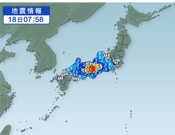 진도는 6 약(弱), 진원지는 오사카 북부