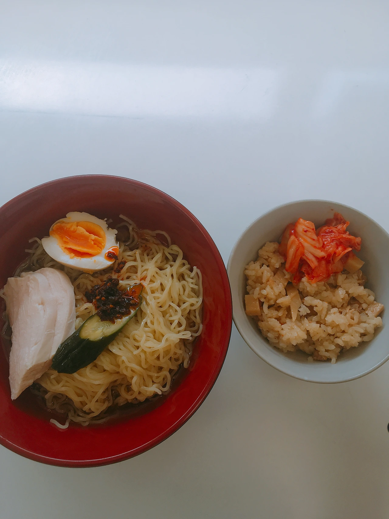 일본에서 유명한 한국 요리 중 하나가 비빔밥이라 사내 식당에서도 종종 나온다. 나름 들어갈 거 다 들어간 비빔밥. 고추장은 따로 준비해주신다. 비빔밥이 나오는 날이면 식당에서 명절날의 할머니집 냄새가 난다. :)