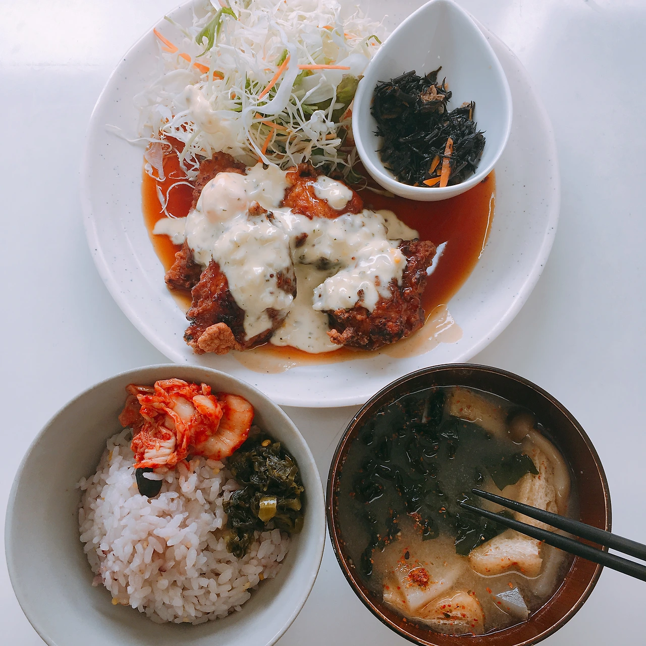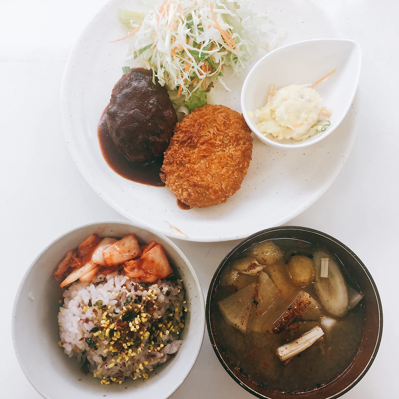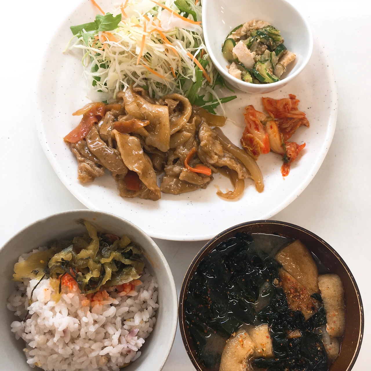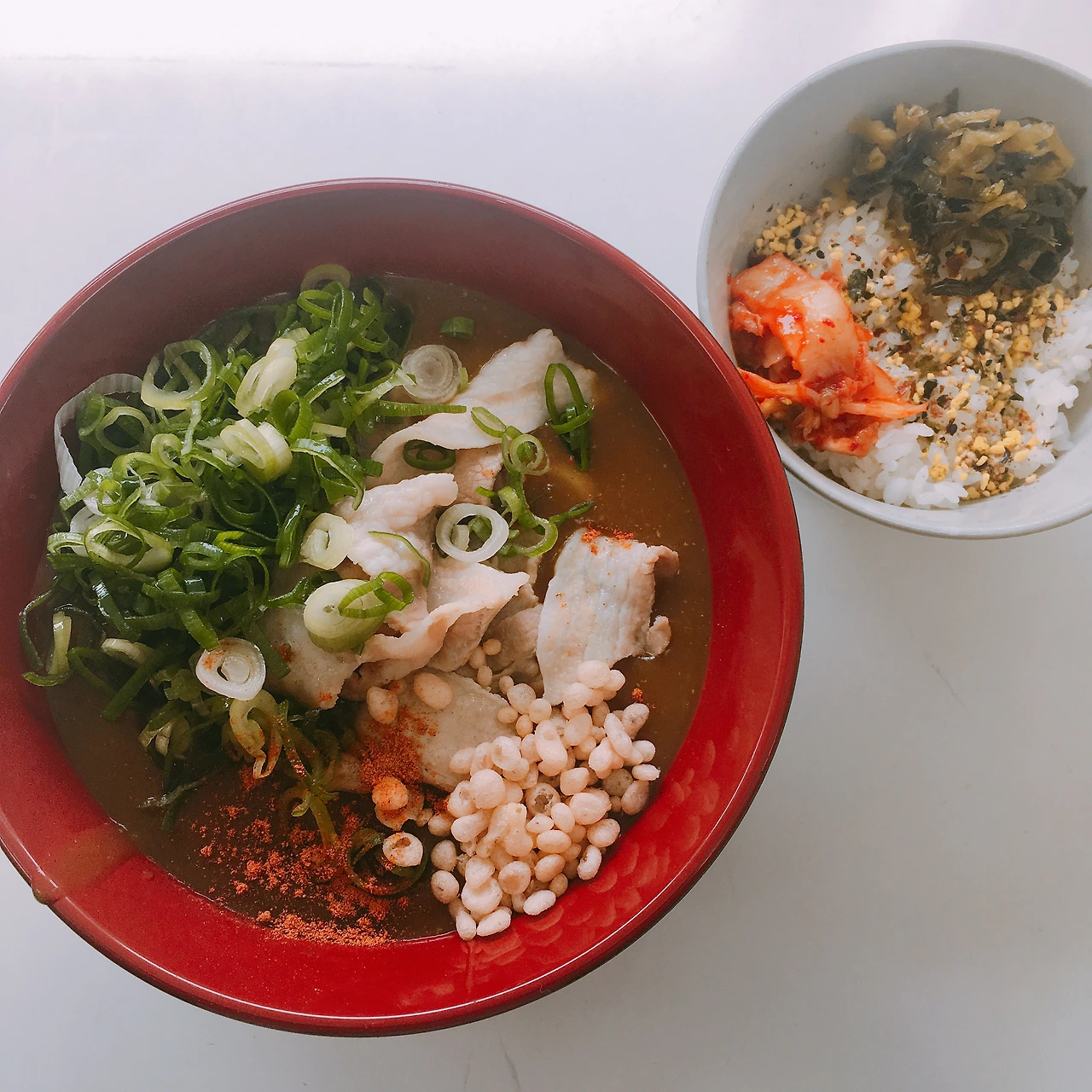 *밥 위에 있는 건 김치와 타카나(高菜)절임. 김치는 일본 내에서 절임류 음식 인기 1위라고 한다.(기무치라 불리우는 건 단순히 ㅁ받침의 발음을 못하기 때문이고 한국 음식이라는 건 아주 잘 알려져있다.)