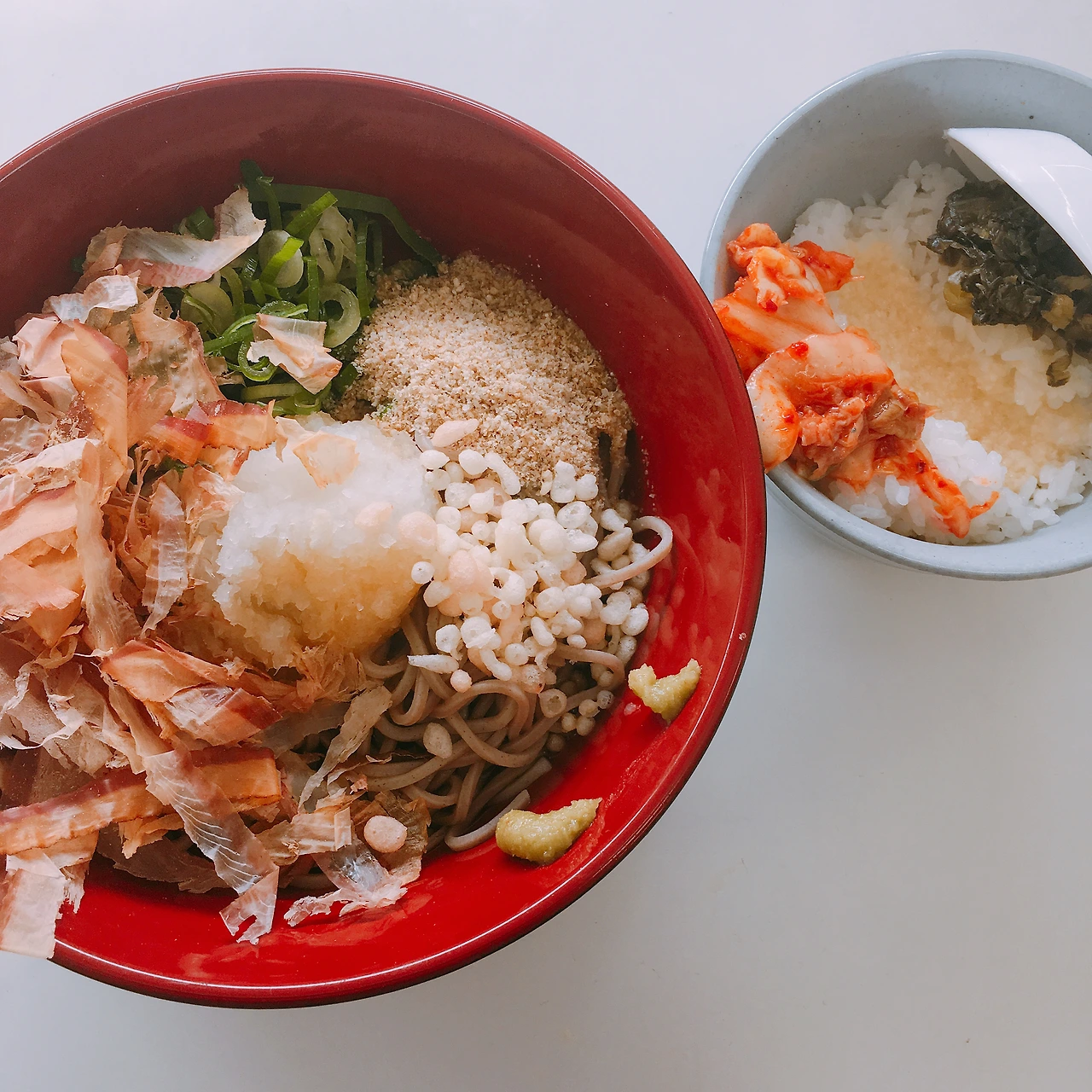 일본에서 메밀 국수를 소바라고 한다. 냉소바 면에 쯔유를 붓고 무 간 것(=다이콘 오로시)을 얹은 것이 오로시 소바. 가쯔오부시와 파, 깨가루 등을 추가해서 섞어 먹는다. (밥 위에 얹어져있는 건 생마 간 것)