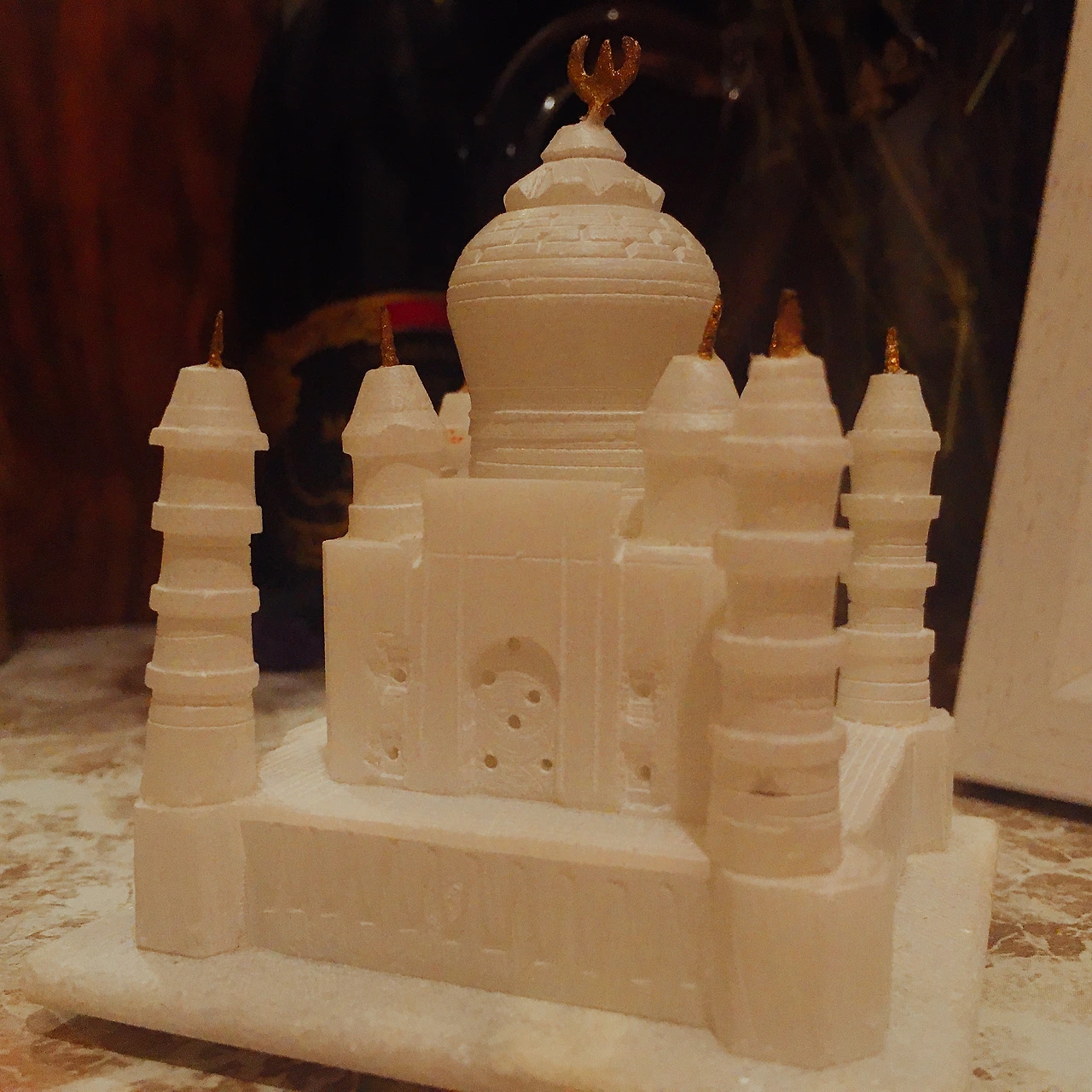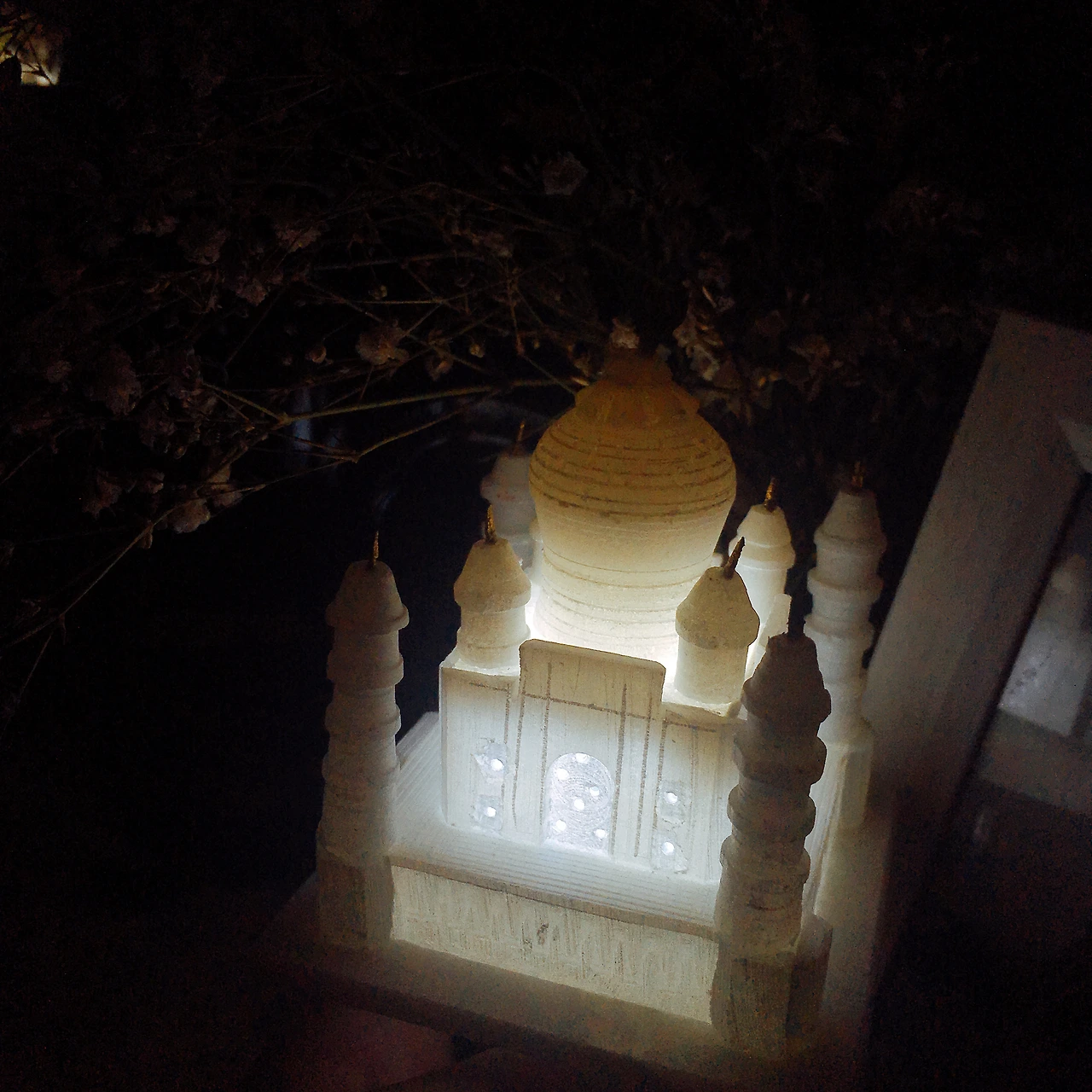 인도는 대리석이 유명한만큼 타지마할 가는 길엔 대리석으로 만든 작은 타지마할 기념품을 판다. 기념품을 많이 안 사는 우리 부부인데 인도 소년이 타지마할 모형 아래에 플래시를 비추는 순간.