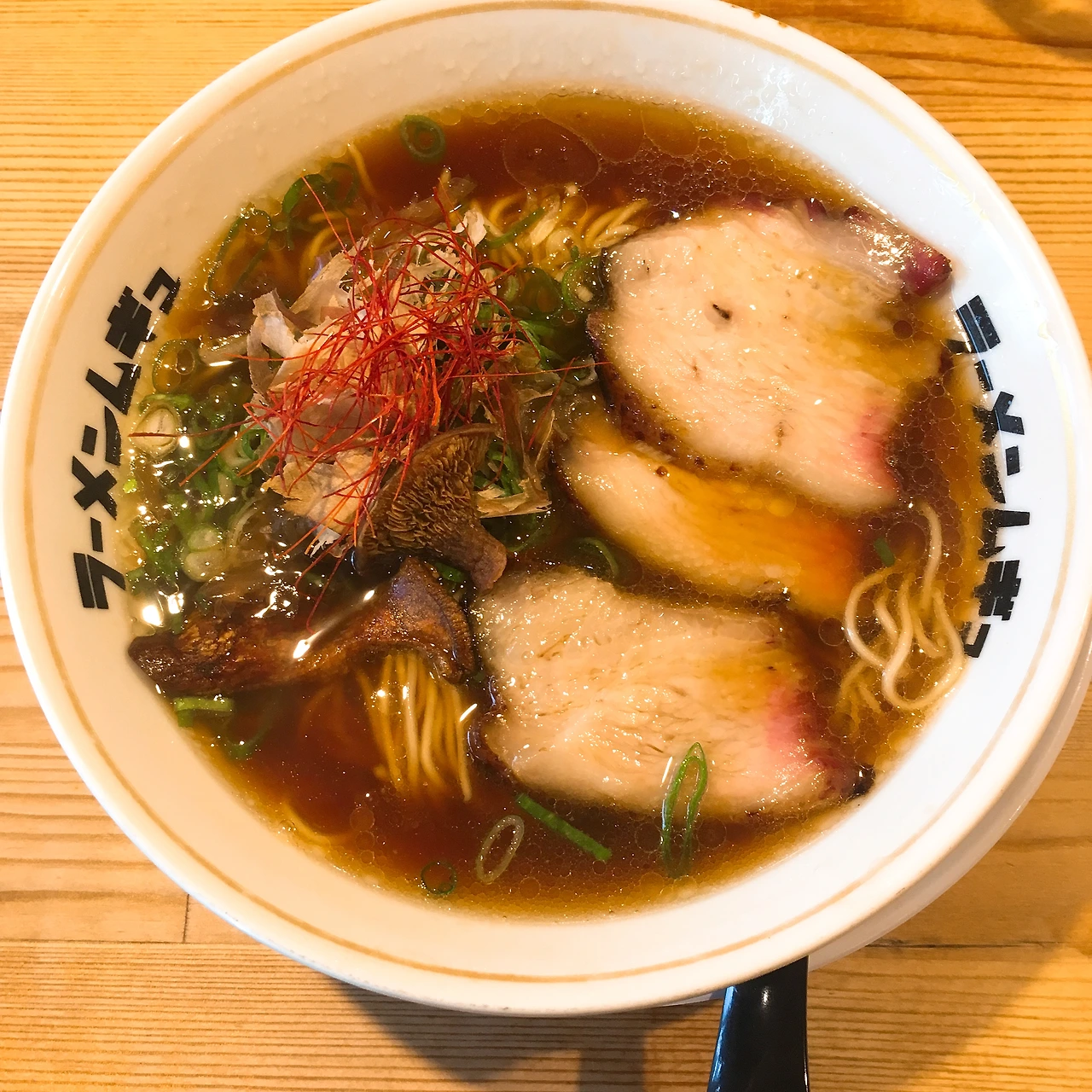 이건 내가 좋아하는 메뉴, 깔끔하면서도 향이 좋은 깊은 맛의 간장 라멘. 돼지고기 차슈, 파, 구운 버섯(이게 포인트), 가쯔오부시 ,실고추 토핑이다.