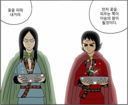아마 웹툰이나 영화를 많이 봤던 사람이라면 이러한 내용이 어딘가 비슷하다고 느껴질 수 있다. 이름은 다르지만 제주도에서 전승되는 '대별왕, 소별왕 창세신화'와 같은 구조로, 웹툰 '신과 함께' 속에 각색된 이야기이기 때문이다. 능력 좋고 현명한 대별왕은 동생 소별왕이 꼼수를 썼다는 것을 알고 있지만, 이승을 동생에게 넘겨주게 된다. 그리고 이승은 혼란해진다. 물론, 대별왕은 위의 미륵처럼 저주를 퍼붓지 않고, 어려움이 처할 때마다 도와주는 모습으로 만화상에 표현되어있다.