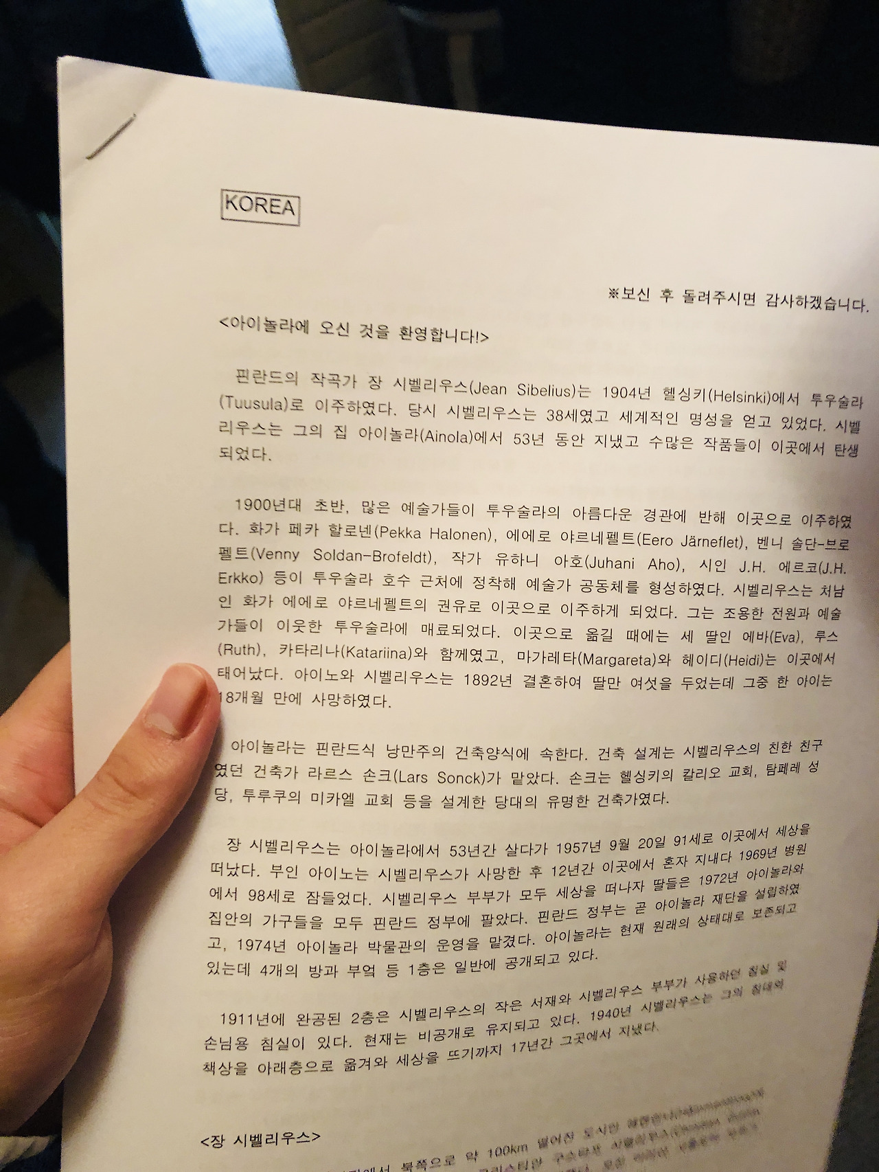 핀란드에 지내면서 가장 추천하고 싶은 장소는 아이놀라(Ainola)이다. 작곡가 시벨리우스의 생가인 이곳은 헬싱키에서 통근 기차를 타고 약 30분 정도 떨어져 있어, 잠시 도시에서 벗어나 핀란드 숲길을 거닐면서 기분 전환하기 좋다. 헬싱키 근교에 눅시오 공원이나 현지인들만 아는 숲길도 많이 있지만 솔직히 말해서 핀란드 숲은 무섭다. 침엽수림이 하늘을 가리고 온갖 이끼 낀 숲을 다니면 한낮에 귀신이라도 나올 것 같다. 무민과 같은 트롤 이야기가 왜 핀란드에서 나오고, 무민 이야기가 대체적으로 음습한 이유를 단번에 이해할 수 있게된다. 만약 너무 오래전에 버려져서 그 속에 나무가 자라고 있는 자동차를 보게 된다면 금상첨화라고 할 수 있다. 그러나 아이놀라는 관리가 잘 되고 있고 사람도 종종 보여 적당하다. 일단 자연이 정말 좋다. 과장이 아니고, 기차에서 내리는 순간 자일리톨 껌 열 개는 씹은 것 마냥 상쾌한 공기가 나를 반겼고, 헬싱키에 돌아갔을 때는 숨이 턱턱 막힐 정도였다.