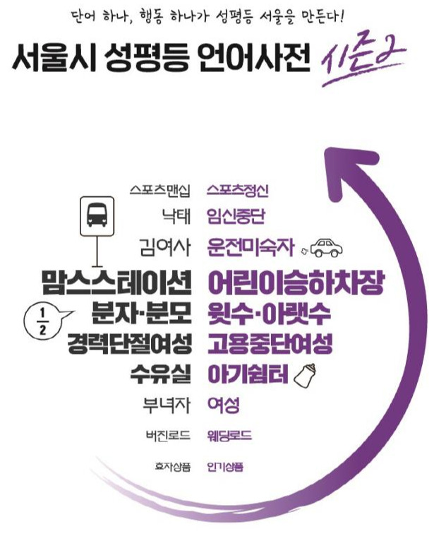 서울시 여성가족재단에서는 작년(2018년)부터 성평등 언어사전을 만들고 있다. 성평등 언어사전이란 (2019년 기준 6월 6일부터 6월 11일까지) 온라인에서 진행된 성차별 용어 바꾸기 캠페인을 말한다. 올해는 701명의 시민이 참여하여 1825건의 개선안을 내놓았다. 이를 바탕으로 재단은 국어학자, 여성학자 등의 전문가들의 검토를 거쳐 대표 사례 10건을 선정했다.