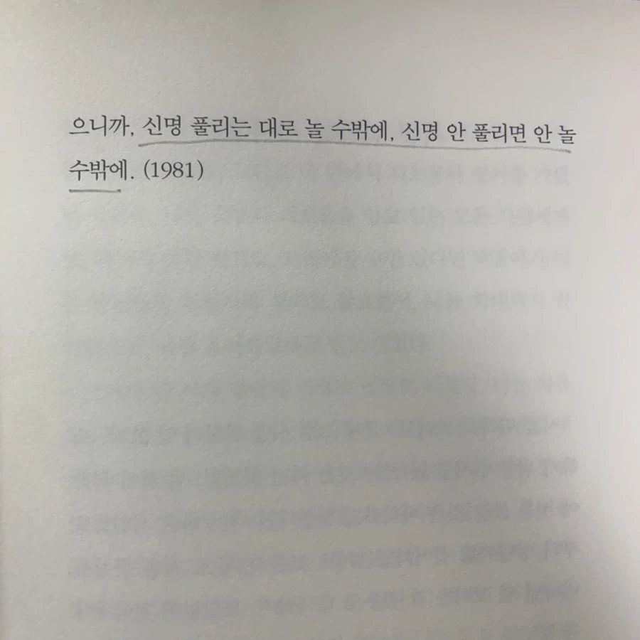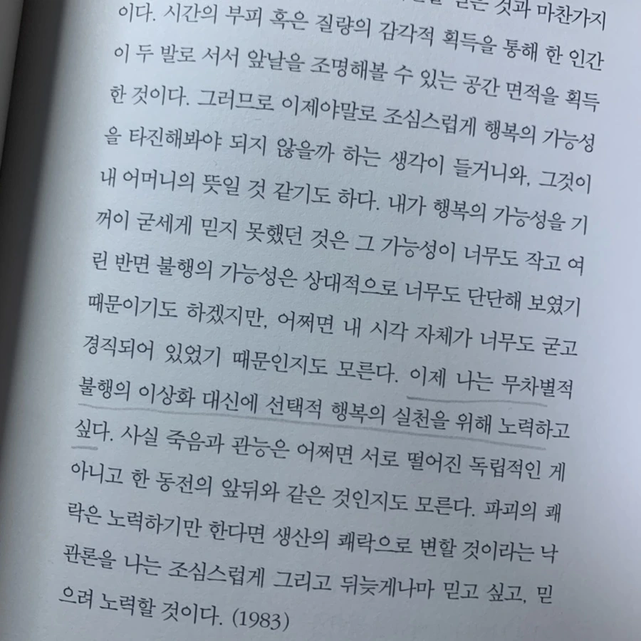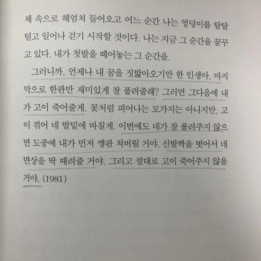 '산다는 이 일' 이 챕터를 읽으면서도 공감이 갔다. 나는 항상 절망을 선택했다. 바로 나 였다. 나에겐 희망은 불확실했고 절망은 확실했다. 그런 시절이 있었다. 터널이 아니라, 심연으로 가라앉는 시절. 빛이 보이지 않는 바다 속으로 가라앉았다. 내겐 삶을 헤처나갈 희망도, 의지도 없었다. 나의 의지대로 되지 않는 인생을 어떻게 해야 할지 몰라. 정말 몰라서. 나는 나를 불행하게 했다. 태어남에 대한 축복이 아닌 불행을, 살아가는 과정이 아닌 죽어가는 과정이라고 생각했던 그 시절을. 하지만 나는 포기 하지 않았다. 최승자 시인처럼 말이다. '신명 풀리는 대로 놀 수밖에, 신명 안풀리면 안 놀수밖에' 이 마음으로, 뜻대로 되지 않는 인생에게 어디 한번 더 해보라는 태도로. 그렇게 나는 그 시절을 견뎠다.
