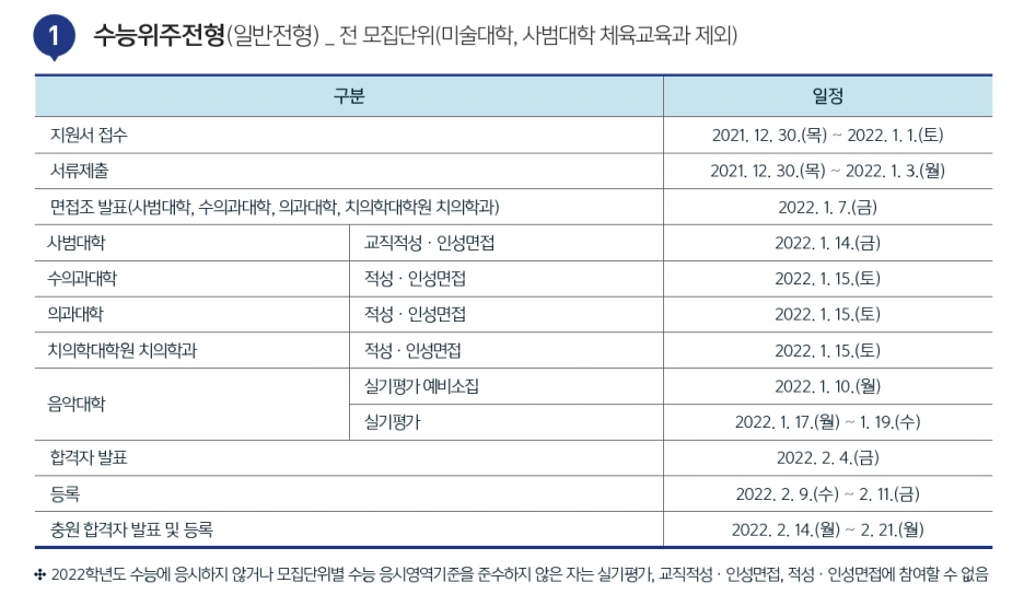 맨 첫번째 사진은 서울대학교 2022년도 전형 일정이다. 명확하게 합불 결과가 언제 나오는지 알 수 있다. 심지어 충원 합격자 발표날도 알 수 있다.