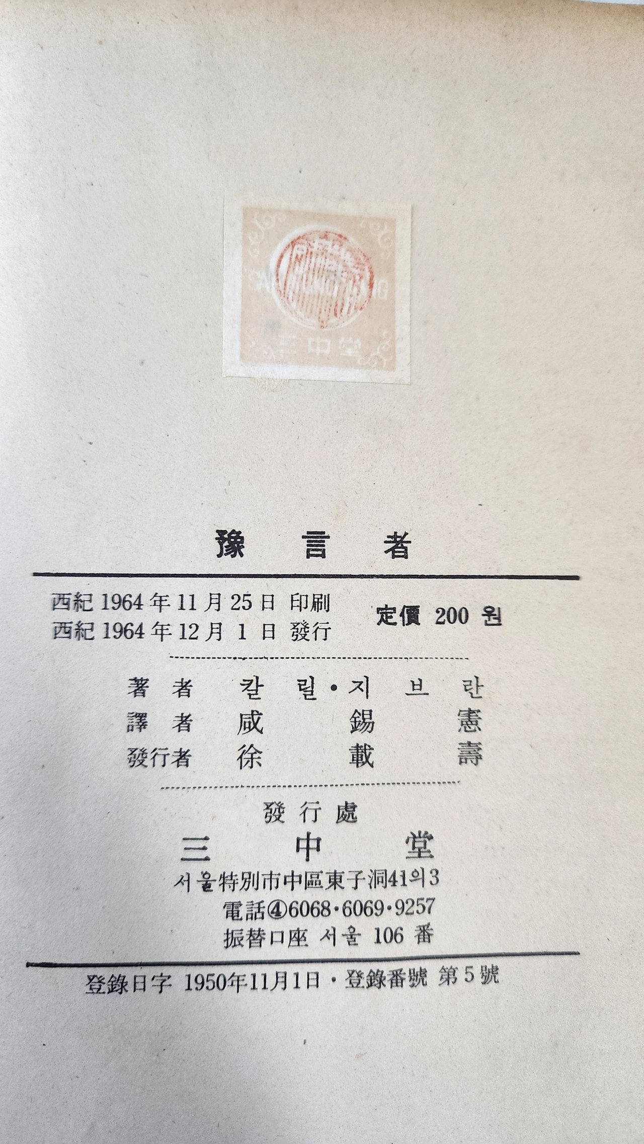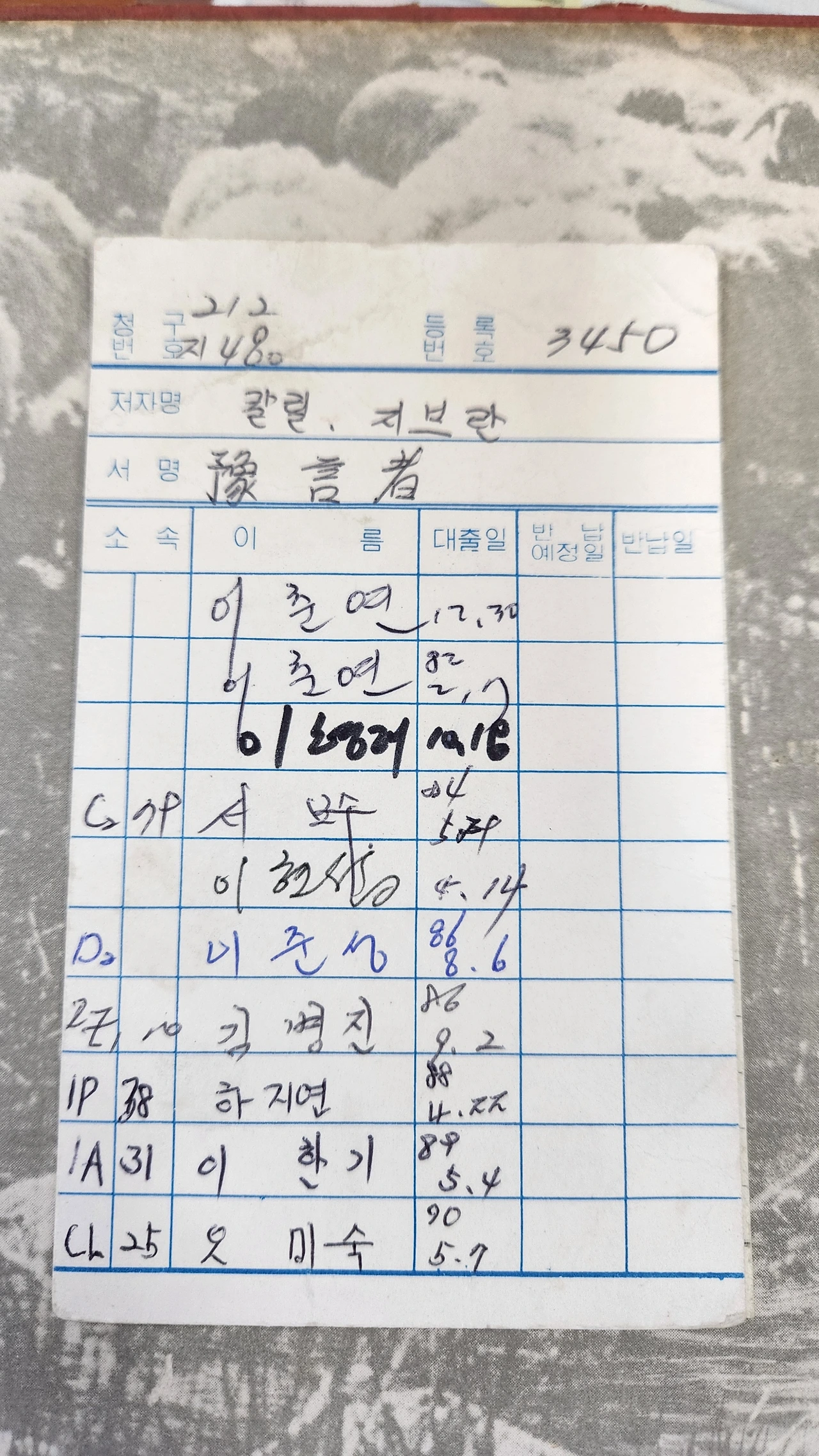 빌린 책 중에는 함석헌 선생님이 번역하시고 삼중당에서 발행한 책 '칼릴 지브란의 예언자'도 있습니다. 1964년 12월에 발행된 책의 마지막 장과 대출 이력표 봉투에는 진주농림(고등)전문학교 도장이 찍혀 있습니다. 정가가 200원이네요. 대출이력표에 적힌 대출자의 이름과 대출 날짜를 보면서 세월의 무게를 가만히 가늠해 보게 됩니다.