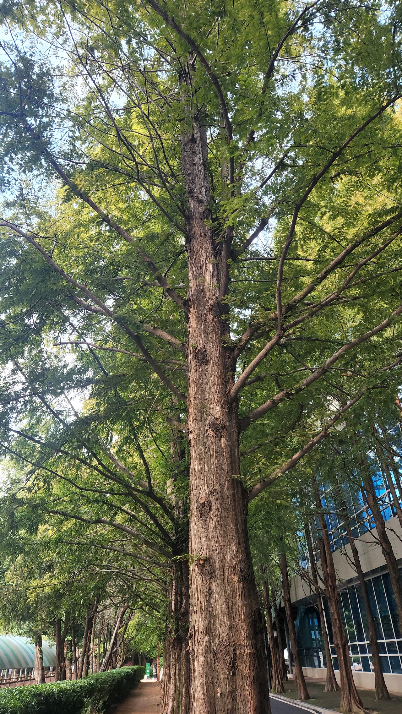 조금 가까이서 찍어 본 메타세쿼이아 한 그루. 몸통이 잘리면서 양갈래로 뻗어올라간 가지와 잘린 부위 바로 아래에 사방으로 자란 작은 가지를 볼 수 있다.