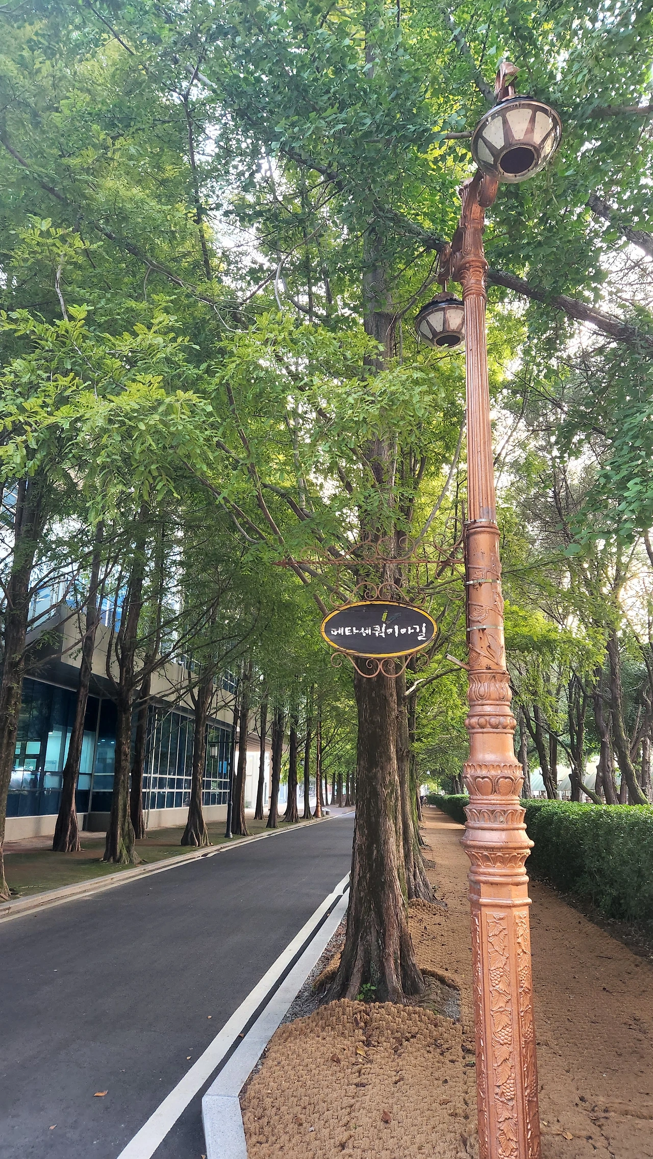 길의 시작을 알리는 표지판 뒤로 늘어선 메타세쿼이아들