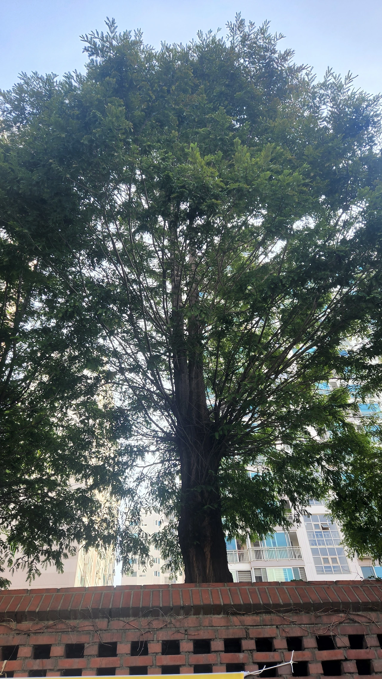 아파트 단지 담벼락 위로 자란 메타세쿼이아들. 가지치기 직후에는 그냥 통나무들이 서 있었다.