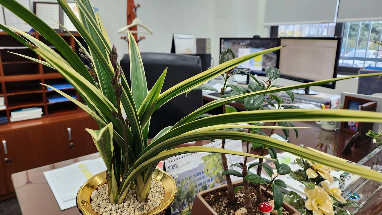 학장실에 놓여 있는 다섯 개의 동양란 화분 중 네 개에, 그리고 작은 석곡 화분 하나에도 꽃이 피었습니다. 동양란들은 원래 이 방에 놓여 있던 것도 있고 취임축하한다고 지인들이 보내 주신 것도 있습니다. 앞서거니 뒤서거니 꽃이 피고 있으니 한 동안은 꽃을 볼 수 있겠습니다. 석곡은 연구실에서 기르던 것을 가지고 내려 왔습니다. 키운지 제법 오래 되었네요. 종종 꽃을 피우기는 하지만 최근 2-3년 동안은 꽃을 피우지 않았는데, 무심히 보고 있던 사이 주말 동안 꽃을 피웠습니다. 큰 란과 석곡 모두 향이 좋아서 따로이 향물(香物)을 두지 않아도 될 만합니다.