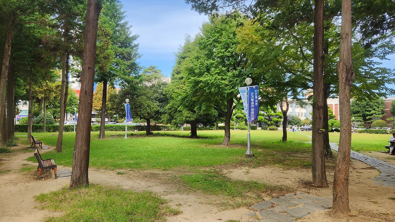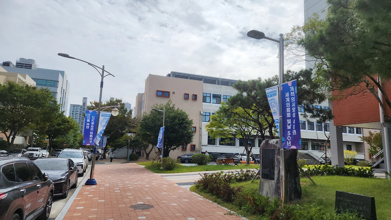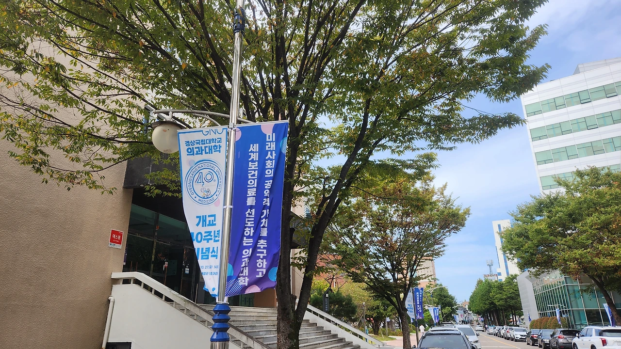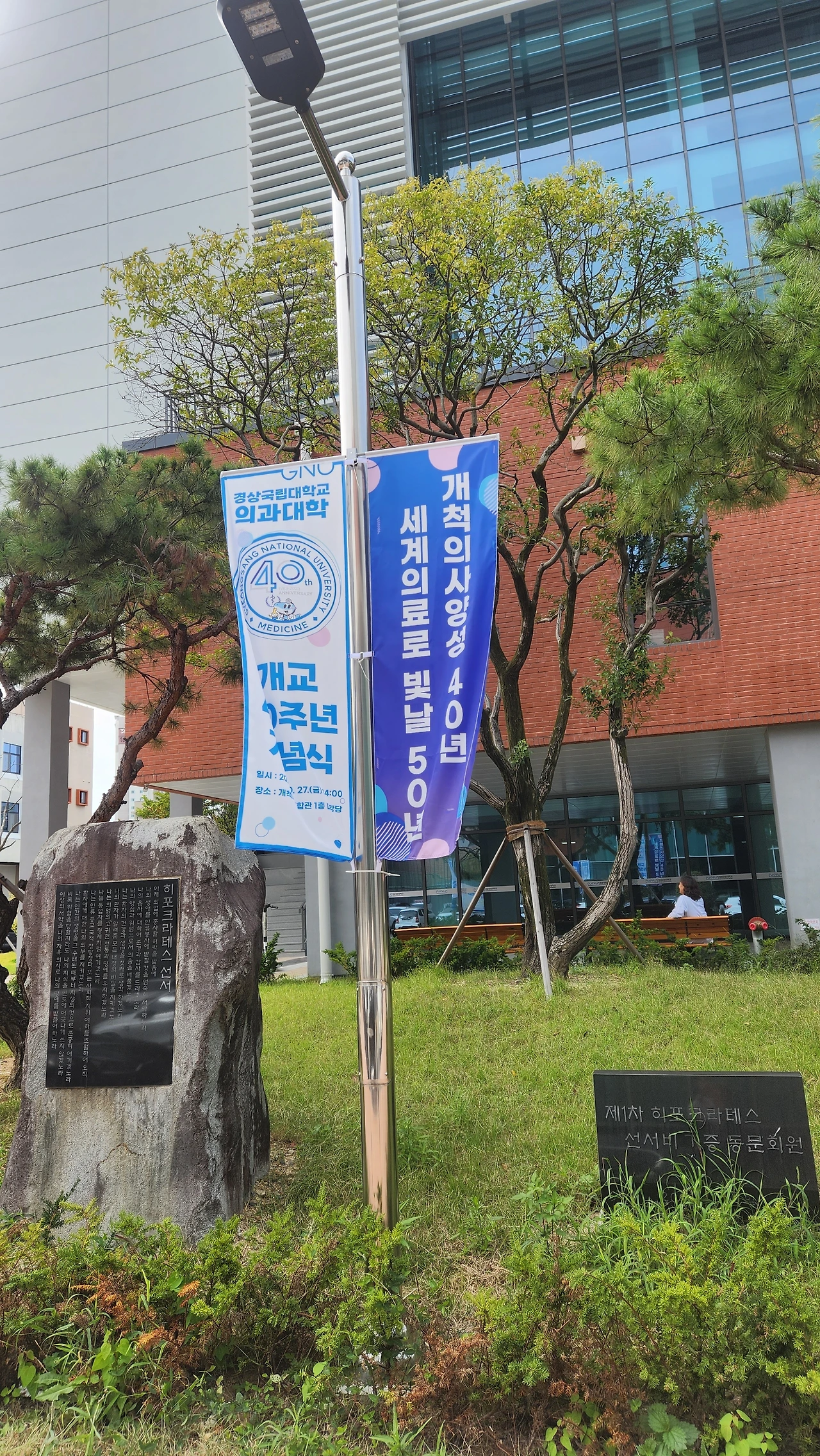 왼쪽에는 40주년 기념식을 알리는 내용을 넣고, 오른쪽에는 우리 학교의 교육비전과 슬로건, 그리고 40주년을 준비하면서 공모한 50주년을 향한 비전 슬로건을 넣어서 스무 쌍을 만들었습니다. 학교를 남북으로 가로지르는 큰길을 따라서 가로등마다 걸고, 학생들의 강의가 이루어지는 개척의학복합관과 맞은편 도로, 그리고 녹지를 중심으로 이어지는 공간에는 조금 집중적으로 설치를 하였습니다.