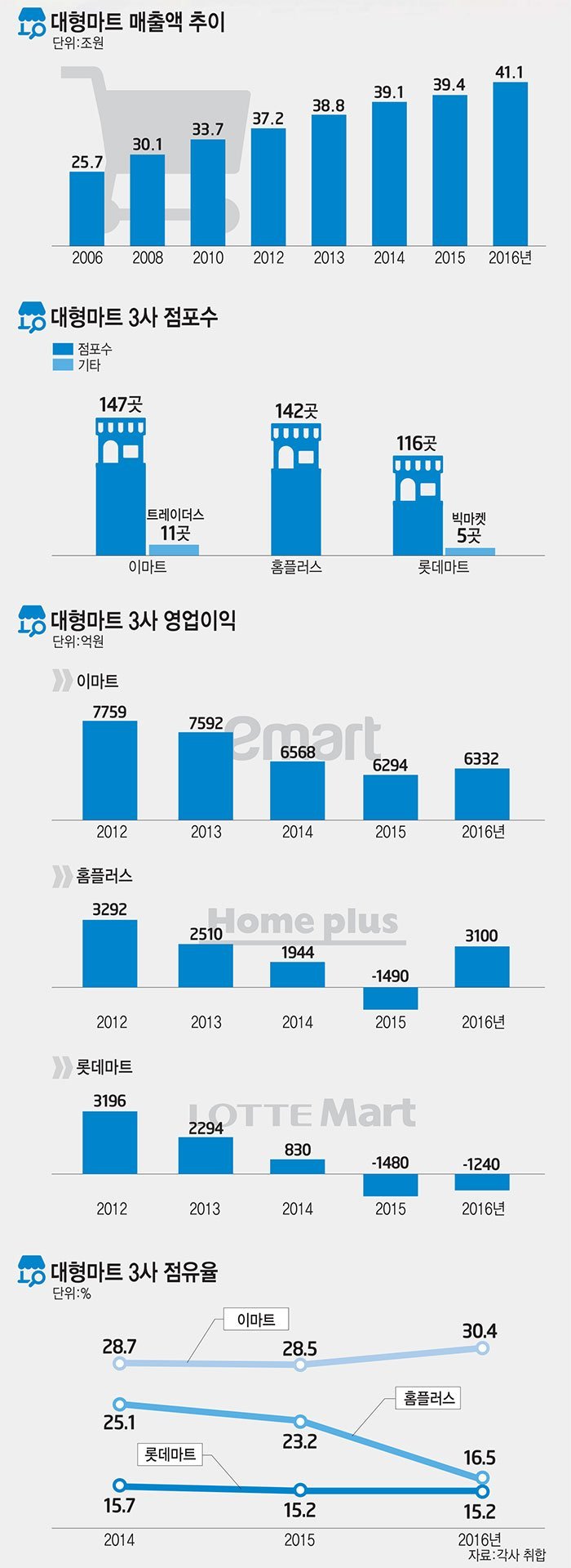 아래 대형마트들의 매출액과 영업이익 추이를 살펴보시면, 해마다 매출액은 증가하는 반면, 3사의 영업이익은 감소하는 경향을 띄는 것을 확인할 수 있습니다.