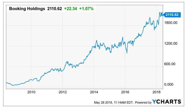 부킹닷컴은 네덜란드 암스테르담에 위치한 온라인 예약 사이트로 현재 약 200여 국가에서 서비스를 제공하고 있습니다. 재밌는 부분은 프라이스라인은 부킹닷컴을 2005년에 약 1500억 원에 인수를 했습니다. 2013년 카약을 2조 원에 인수한 것에 비하면 아주 저렴하게? 인수한 셈이죠, 2005년에 인수한 부킹닷컴은 현재 프라이스라인 매출 중 50% 이상을 발생시키고 있습니다. 부킹닷컴을 보유한 부킹홀딩스의 지난 10년 동안의 주가 추이를 보면 프라이스라인이 얼마나 북킹닷컴을 인수를 잘 했는지 알 수 있습니다^^: