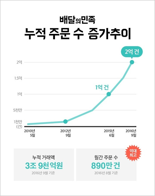 배달앱 업계 1위인 '배달의민족'을 운영하는 우아한형제들은 2011년 창업 당시 16명이었던 직원 수는 현재 700여명에 달하며, 배달의민족을 통한 주문 건수도 2014년 520만건에서 2017년 1700만건을 돌파하며 새로운 시장을 만들 뿐 아니라 우리의 라이프스타일에도 변화를 주고 있습니다.