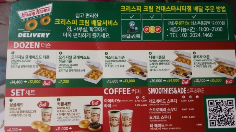 얼마 전 문 앞에서 별견한 크리스피도넛 전단지입니다. 과거와 달라진 점을 발견하셨나요? 바로 전단지 상단에 '배달의민족' '요기요'로 배달이 가능한 것이 인상적입니다.