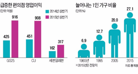 통계청에 따르면 2000년 15.6%였던 1인 가구 비중은 2015년 27.1%로 늘었습니다. 이 같은 1인 가구의 증가로 가장 눈에 띄는 변화는 식품 소비입니다. 혼자 사는 소비자들은 많은 양보다는 간편하게 조리가 가능한 제품을 선호합니다. 업계에 따르면 편의점 도시락 시장은 올해 3500억원 규모로 성장할 전망이라고 합니다. 이는 지난해(2500억 원)와 비교해 40%가량 신장한 수치입니다.