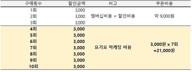 언론에 공개된 데이터들을 바탕으로 추론해 보면, 8월 한 달간 멤버십 매출을 고려한 쿠폰 비용은 (4회 이상 결제부터 해당) 약 55~65억 원이 들지 않았을까 추측해 볼 수 있다.