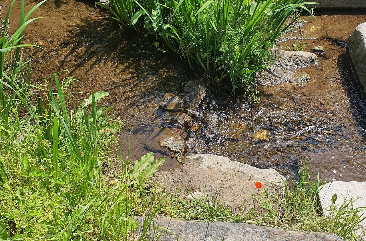 물가에 핀 주황색 꽃을 한참 바라보았다.